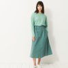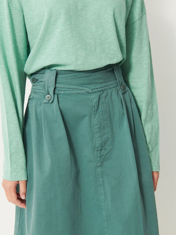 The Klea skirt is a flared gabardine skirt featuring a fly front and side slash pockets. It has an adjustable buttoned waistband with buttoned belt loops. Pleats are added to the front with darts at the back. Its hem is topstitched at the bottom.