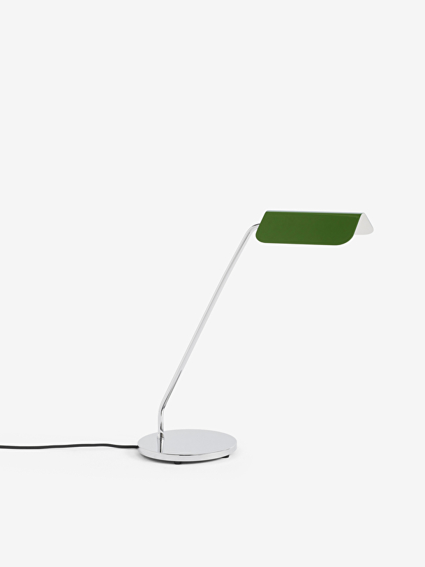 Taking inspiration from the classic Banker's Light lamp, British designer John Tree has fused archetypal references with his contemporary, colorful sensibility to create the Apex lamp. The folded steel shades create a shaped silhouette roof, inspiring the lamp's name and providing a graphic contrast with the chrome bases. Apex offers a functional lighting solution for a multitude of spaces and uses, whether as a task lamp on a desk, a reading lamp on a bedside table, or a point of light on shelves.