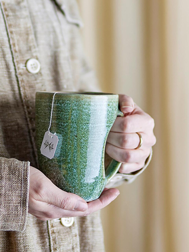 The Aura Mug by Bloomingville is designed with a rustic glaze in varying shades of green. The mug has a comfortable grip and a glossy finish that highlights its organic shape. The mug is perfect for enjoying your morning coffee and adds a sense of comfort to your daily rituals.