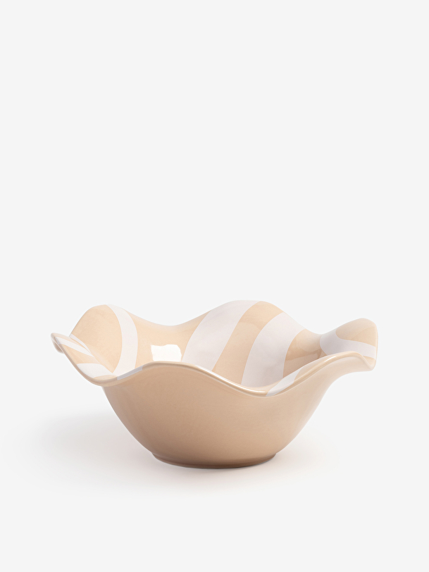This retro-style bowl has undulating lines. It is decorated with two-tone tone-on-tone patterns. The two-tone print, combined with the fluid shapes, brings all your vintage desires to life. It can be used to present food or as a storage bin in an entryway.