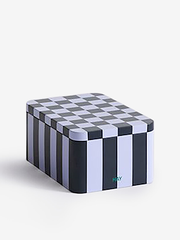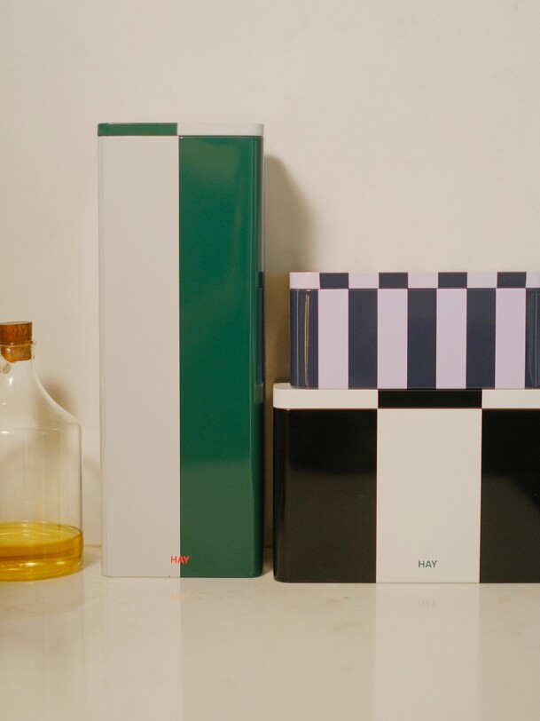 HAY Tin Cans are a collection of functional and decorative storage containers featuring colourful checkered patterns and a glossy finish. The lid and container are perfectly aligned, giving a sleek and seamless look, while ensuring a tight seal suitable for storing dry foods. Available in a wide range of sizes, shapes and designs, the cans can be placed decoratively on shelves or tables around the home to store and organise a variety of items.