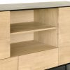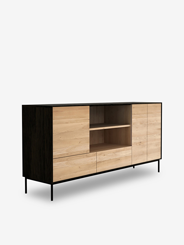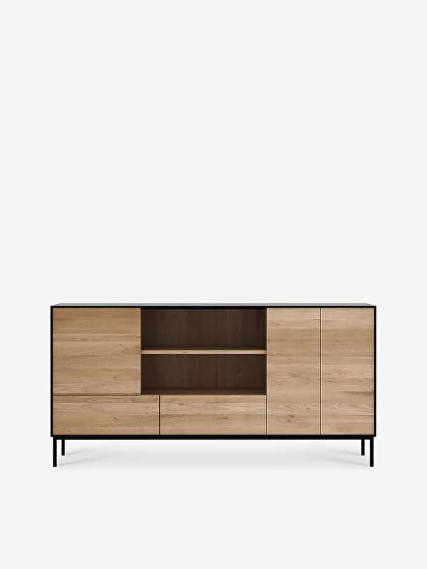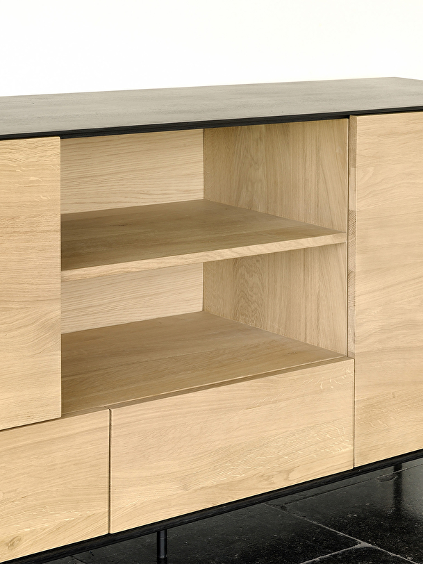 With his Whitebird and Blackbird collections, designer Alain van Havre plays on the contrasts of the elements that make up the silhouette of the proposed furniture. This graphic sideboard is composed of a solid oak body and a metal base with a pure line, all in a contemporary style. Equipped with numerous storage spaces, it will allow you to display your art books or other collections thanks to its central shelf. For authentic beauty, the wood selected from European forests may contain natural knots and cracks that make each piece of furniture unique. Available in several finishes.