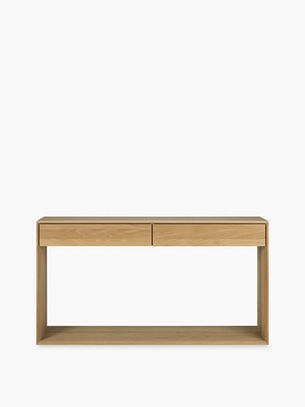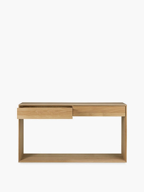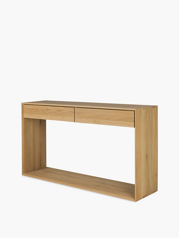 The Nordic collection offers a series of solid wood furniture that combine graphic lines and clean design. They all have in common an open rectangular base that gives the whole a lightness contrasting with the solid character of the oak. This minimalist console will allow you to discreetly display and store your personal belongings, whether in the entrance, the bedroom or the living room. For authentic beauty, the wood selected from European forests may contain natural knots and cracks that make each piece of furniture unique.