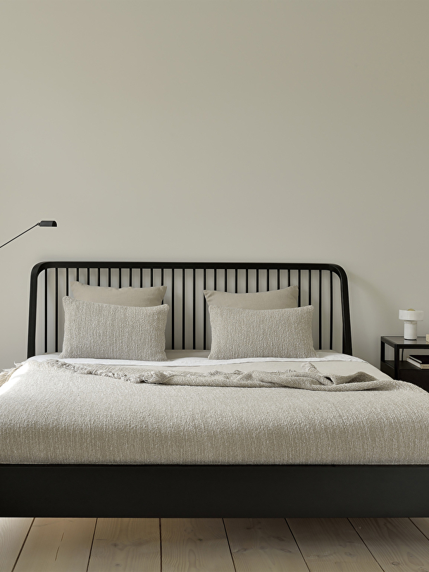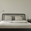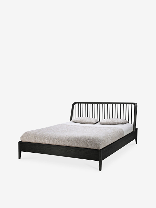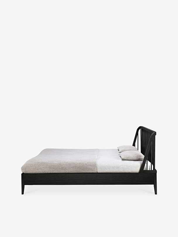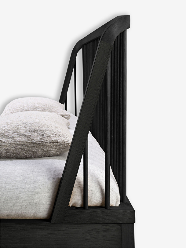 Designed by Nathan Yong, the Spindle bed frame in solid oak features a headboard composed of a regular alignment of bars, like an unfolded wheel from which the designer drew his inspiration. A pure and structured line that will find its place in the bedroom where you can associate it with the bench and the night tables from the same collection.. For authentic beauty, the wood selected from European forests may contain natural knots and cracks that make each piece of furniture unique. Available in various sizes and finishes.