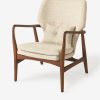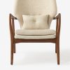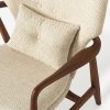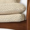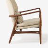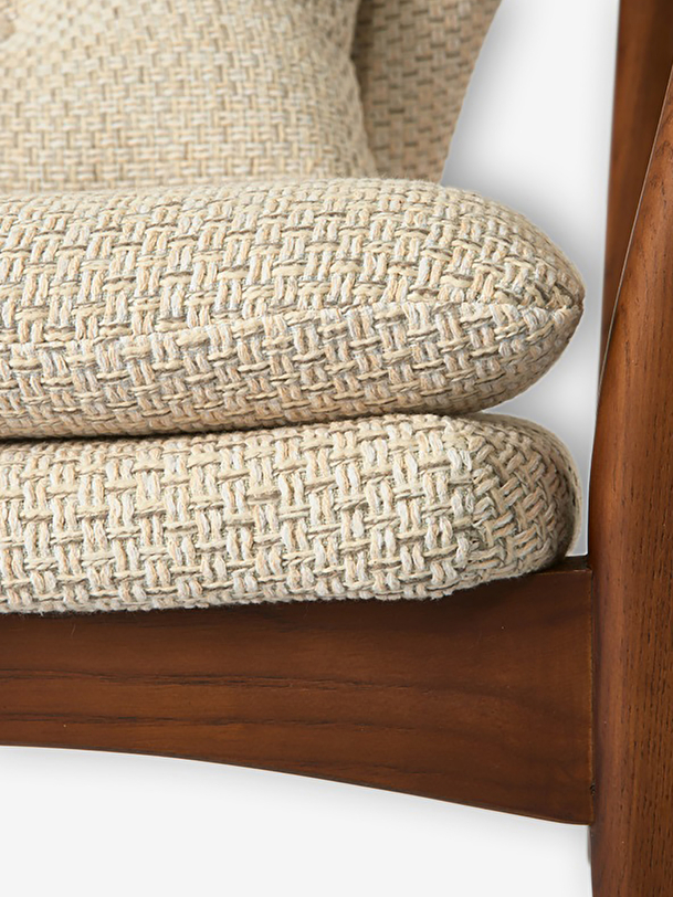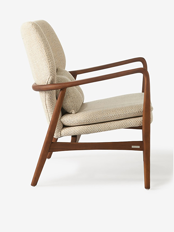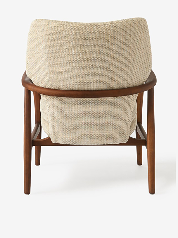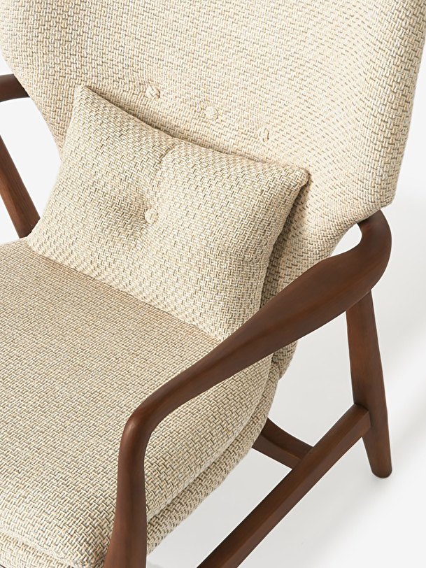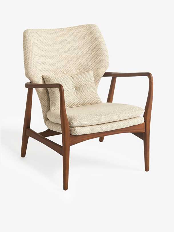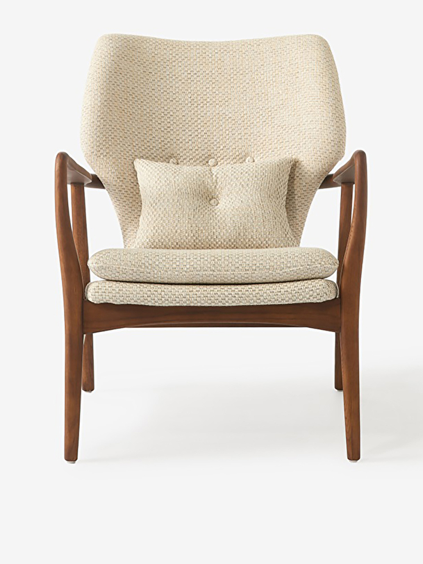 The silhouette of the Peggy armchair, an ode to the Scandinavian style of the 1950s, is composed of a polished ash structure (100% FSC) with a rounded and refined look and a wrap-around seat dressed in mottled fabric, adorned with 3 buttons on the back.The woodwork is handcrafted, while maintaining impeccable finishes. A timeless style that will slip into your interior, from the bedroom to the living room, emphasizing a sober and elegant intention. A small cushion covered with the same fabric as the seat is provided.