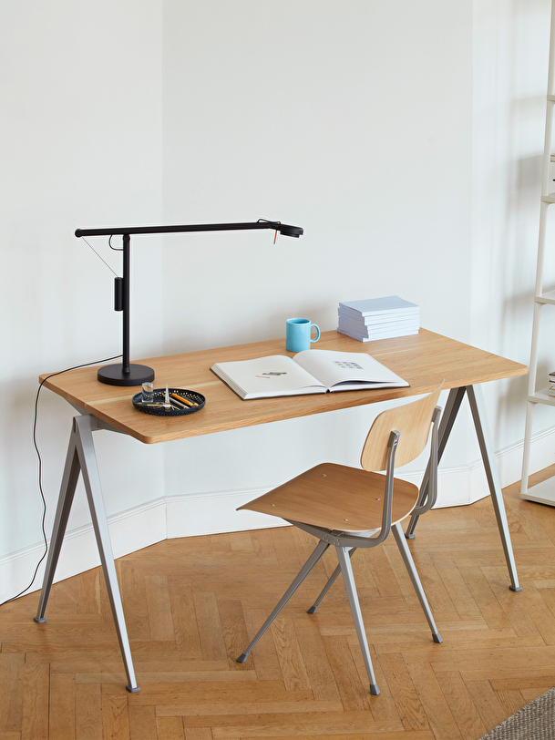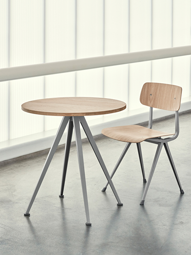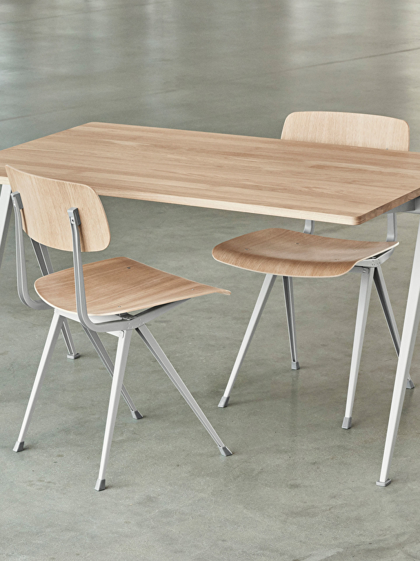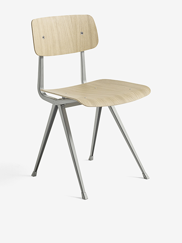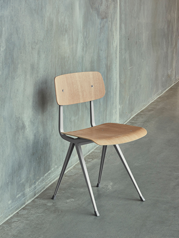 The Result chair was originally designed in the 1950s by Friso Kramer and Wim Rietveld. This is where the duo developed the chair for Ahrend, which has now been relaunched in collaboration with HAY. The slender frame, cut from steel plates and lacquered in neutral colours, is particularly characteristic of Result. In combination with an ultra-thin seat and backrest in lacquered oak, the chair achieves an exceptional lightness that at the same time makes the furniture easy to integrate into the interior.