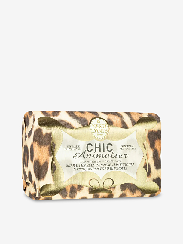 Chic Leopard Soap, Myrrh, Ginger Tea and Patchouli for a sensual and provocative note, 250 grs, Made in Florence, Italy, according to the artisanal saponification methods by Nesti Dante, 100 % based on natural and vegetable ingredients, dermatologically tested, not tested on animals