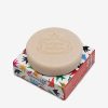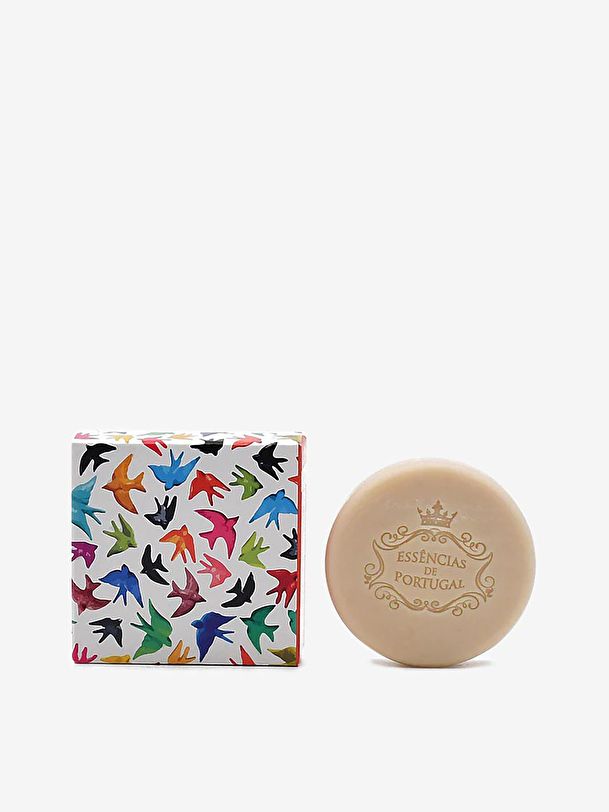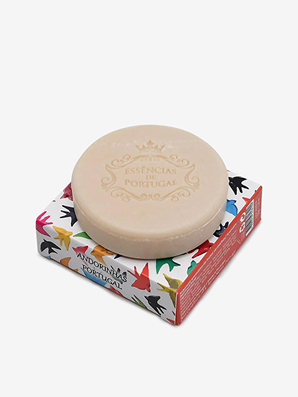 A small, round soap with a red fruit scent, with packaging reminiscent of one of the symbols of Portugal, the “andorinhas”.