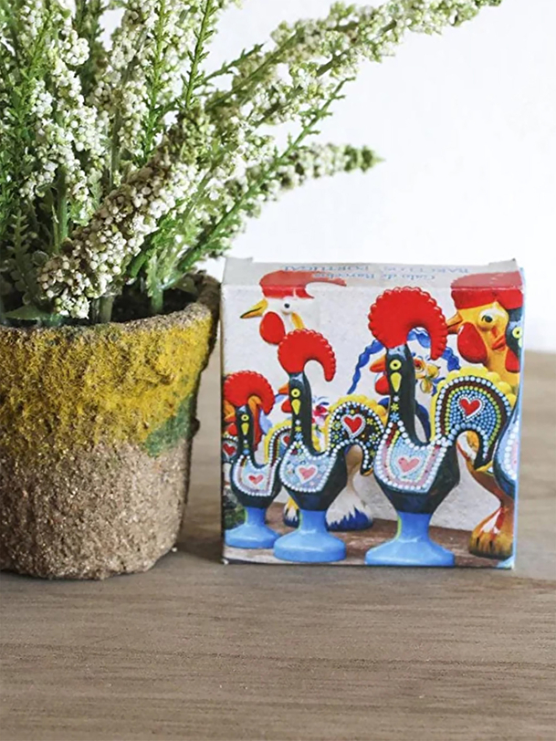 A small, round soap with a cherry scent, with packaging reminiscent of one of the symbols of Portugal, the Rooster of Barcelos.