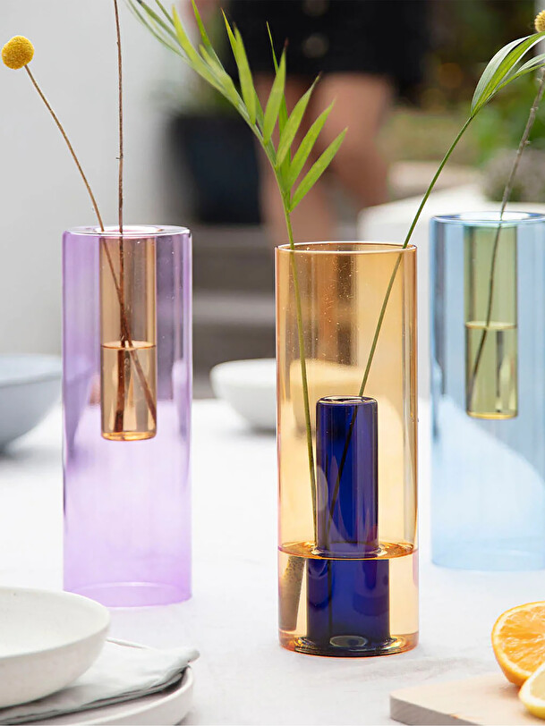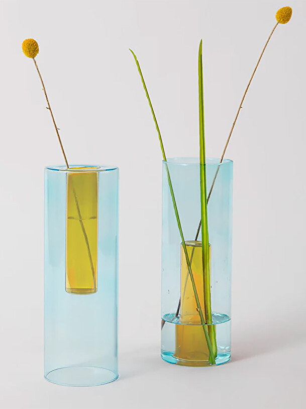 Reversible vase with two colors. Made of borosilicate glass for a clean and smooth finish.