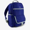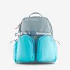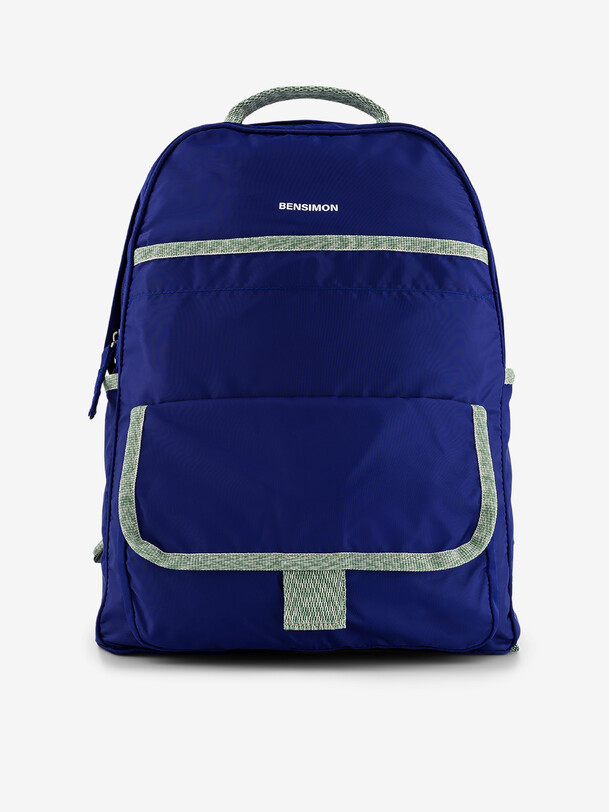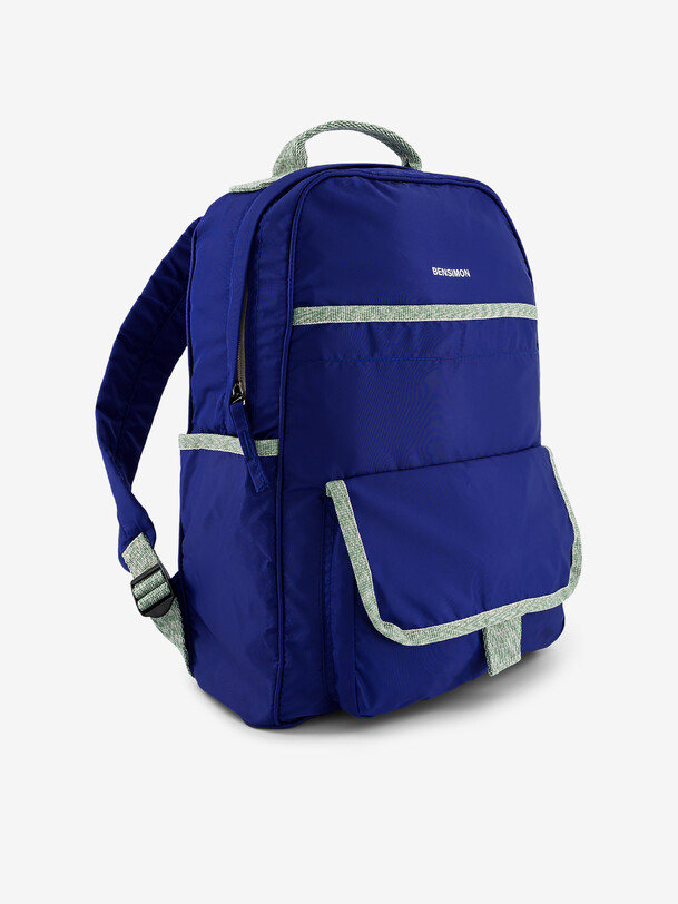 Backpack with a zipper closure. It has a large front pocket with a magnetic snap closure and two side pockets. There is also an interior zippered pocket. Its dimensions are 30 cm long, 12 cm wide, and 39 cm high.