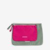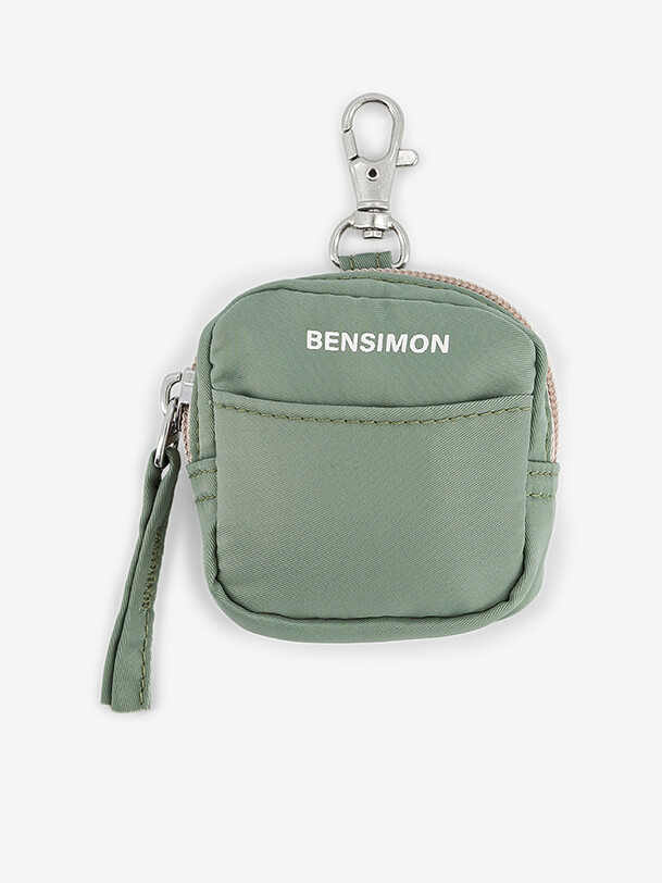Small headphone bag with a zippered pocket and a front pocket. It features a handy carabiner. Its compact dimensions are 7 cm long, 3 cm wide, and 7 cm high. Zipper closure.