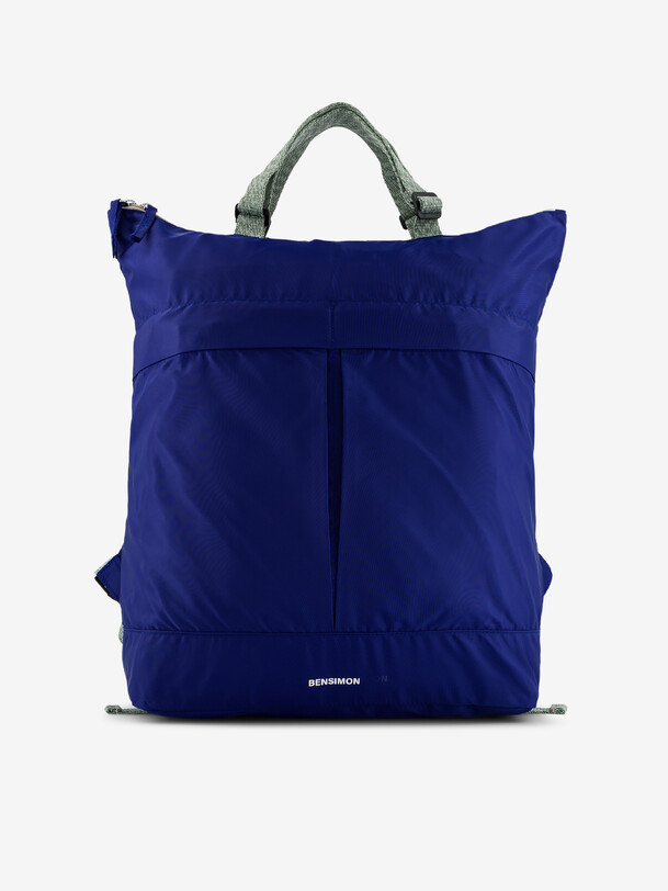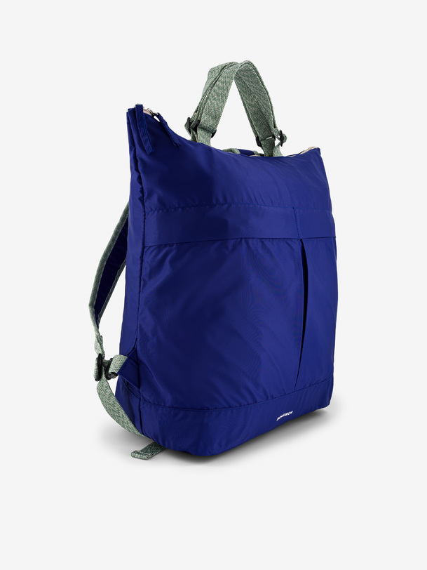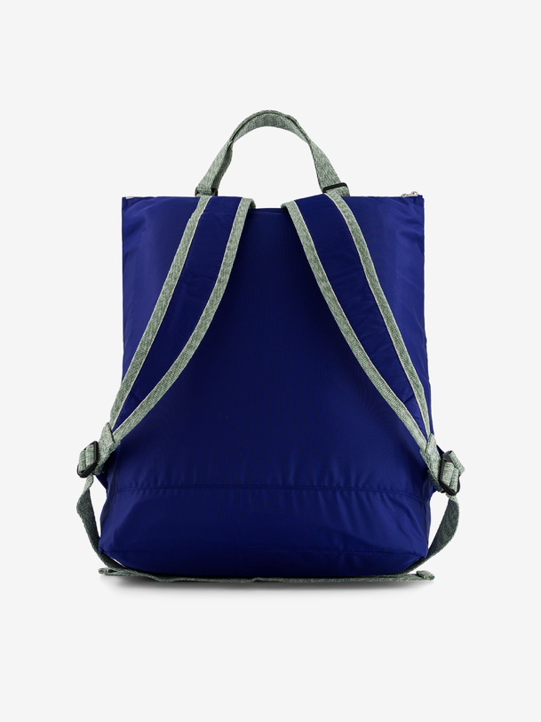 Backpack with a large zippered pocket and two front snap pockets. A handle for carrying by hand or over the shoulder, and retractable back straps. One interior zippered pocket and one foam-reinforced laptop pocket. Dimensions: 44 x 20.5 x 44 cm. Zipper closure.