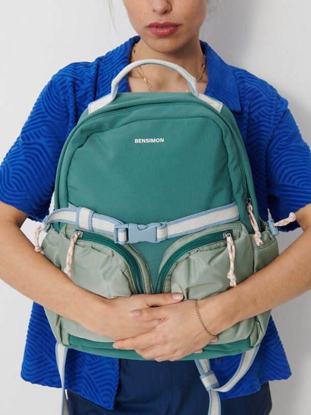 Description: Montfleur backpack with zipper closure. It features a large main zippered pocket, two zippered front pockets, and two slip side pockets. There’s also an interior zippered pocket. Its dimensions are 31 cm long, 12 cm wide, and 38 cm high. The handle is adjustable.