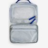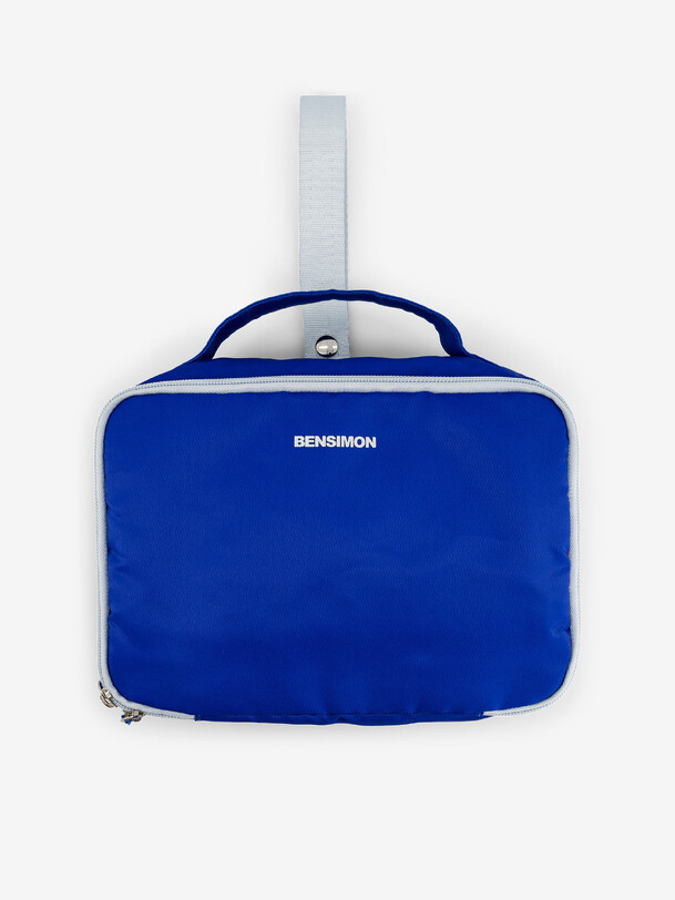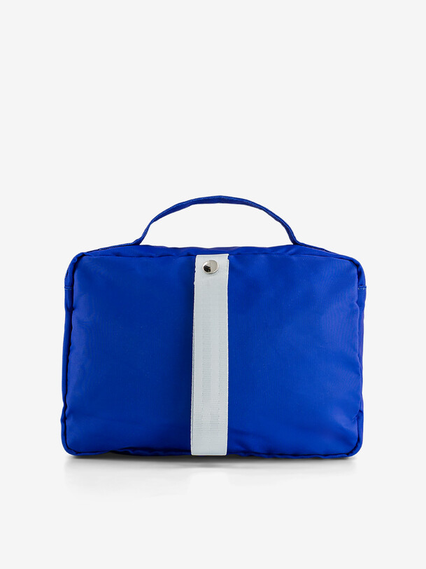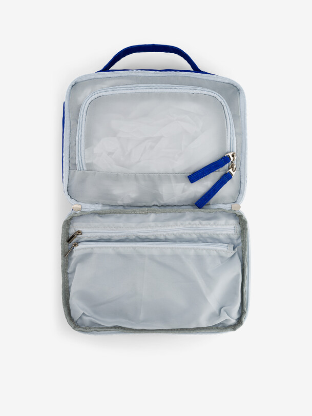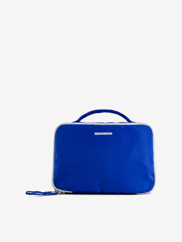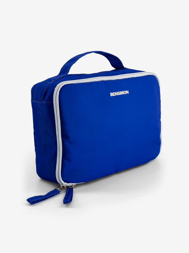 Double-zip pencil case. It features two interior zippered pockets and one deep double-zip pocket. It measures 24 cm long, 6.5 cm wide, and 17 cm high. Zipper closure.