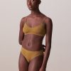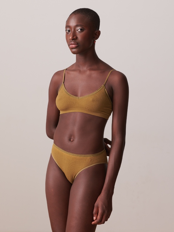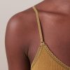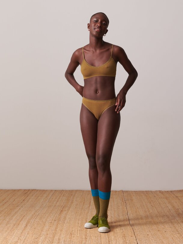 Ribbed bralette with rounded V-neck and scalloped edge. Thin adjustable straps. Diagonal ribbing.