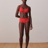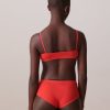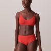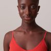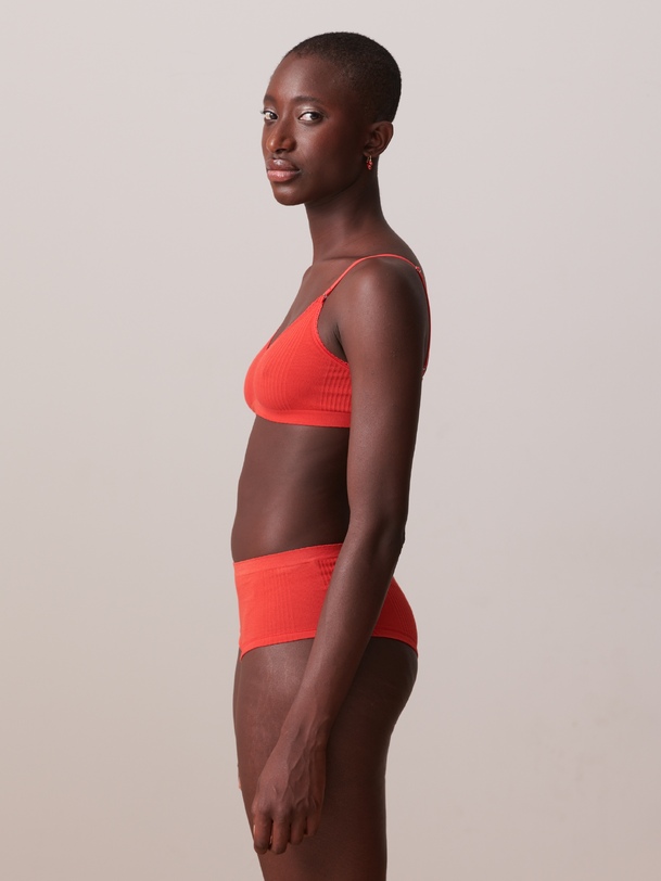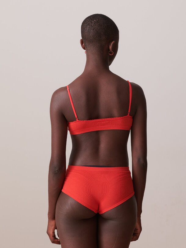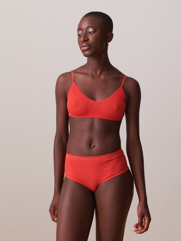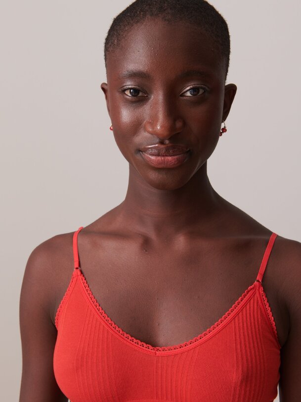 Ribbed bralette with a rounded V-neck and scalloped edge. Thin, adjustable straps. Diagonal ribbing.