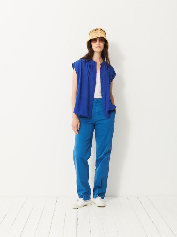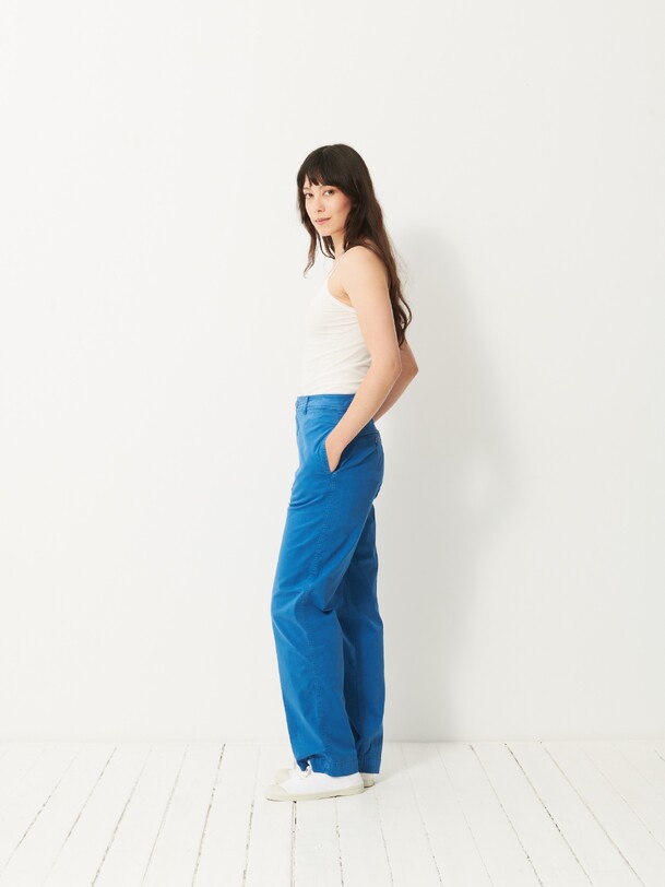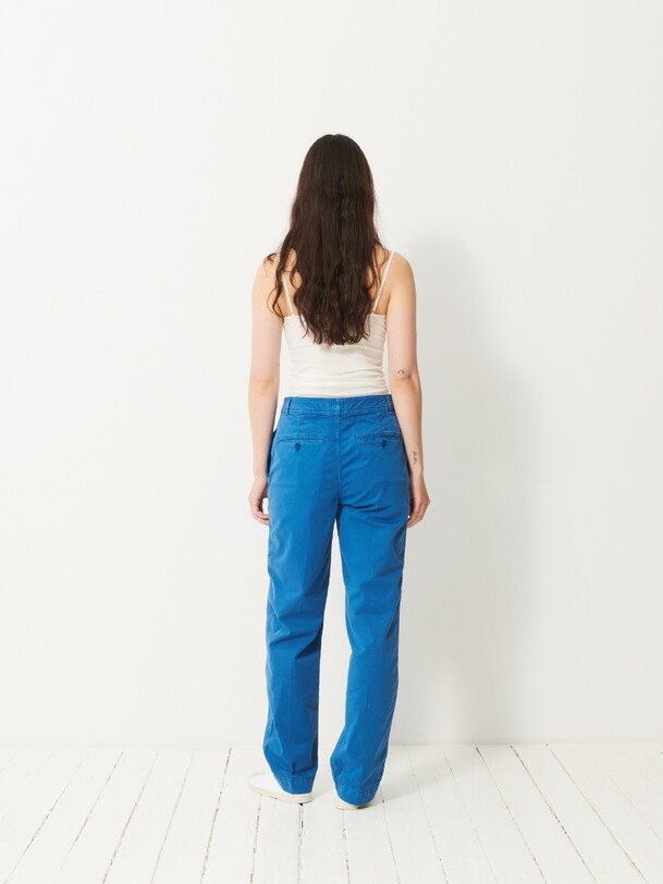 Chino trousers in gabardine with a low-rise waist. They feature welt pockets at the sides and a fly front. There are pronounced creases at the front and back centre. The back welt pockets are buttoned.