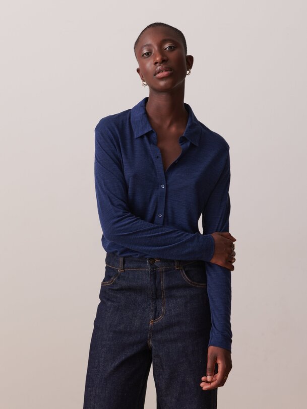 The Cylena shirt opts for restrained simplicity: a straight cut in slubbed jersey, long sleeves and a classic collar for a clean, luminous drape. Its slightly shirttail hem and straight volume create an easy-to-wear silhouette that slips just as well under a low-neck sweater as beneath a structured jacket. Crafted from a Tencel-wool blend, it combines softness, lightness and a subtle textured finish — an essential to adopt throughout the season.