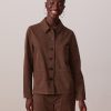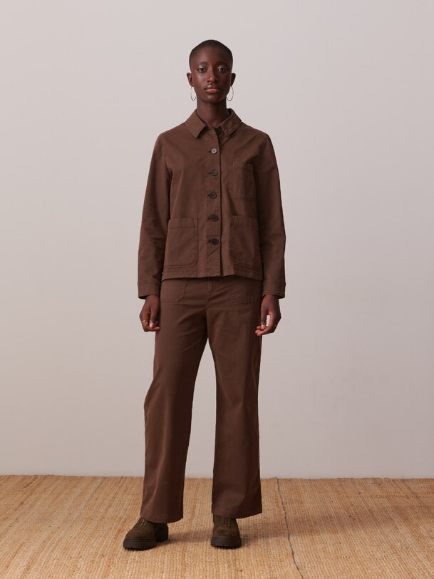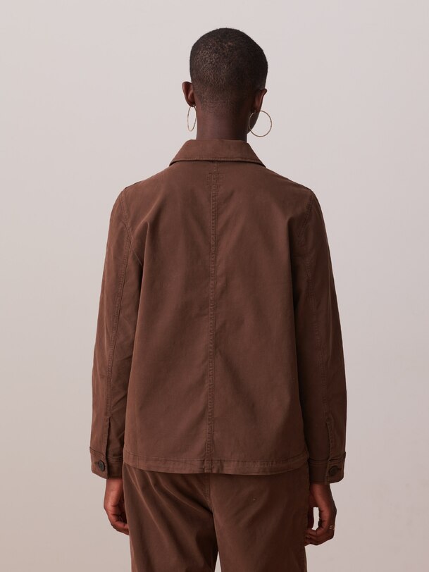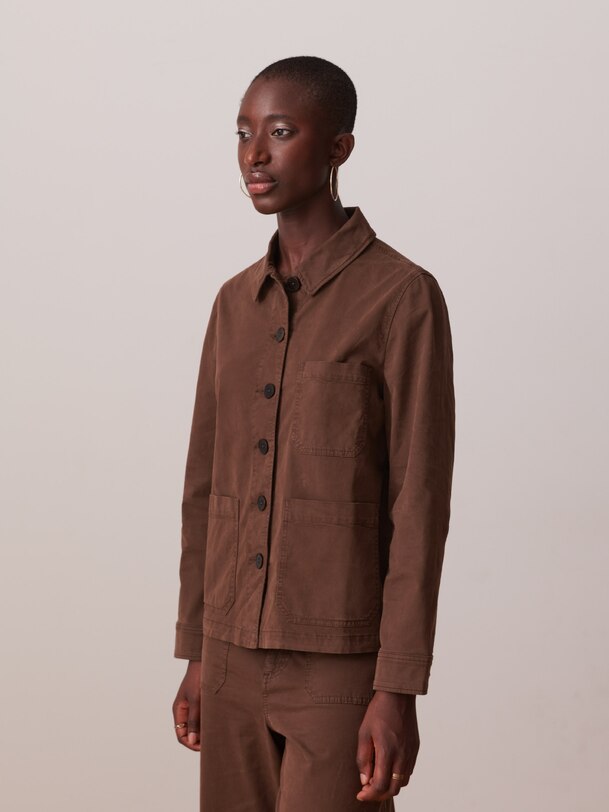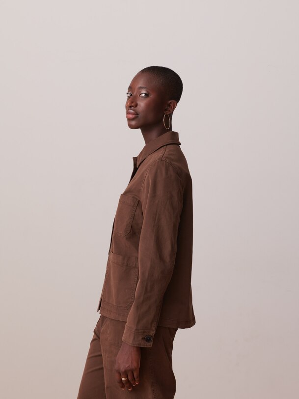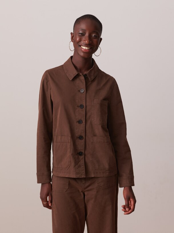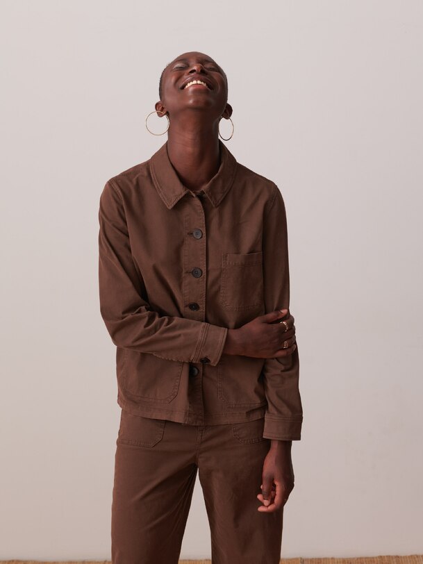 The Golta jacket has a buttoned front with a classic collar and patch pockets. Its sleeves are long with buttoned cuffs.