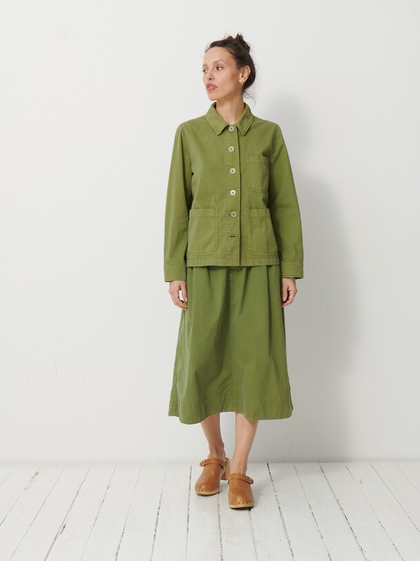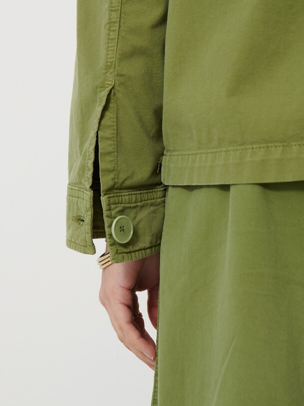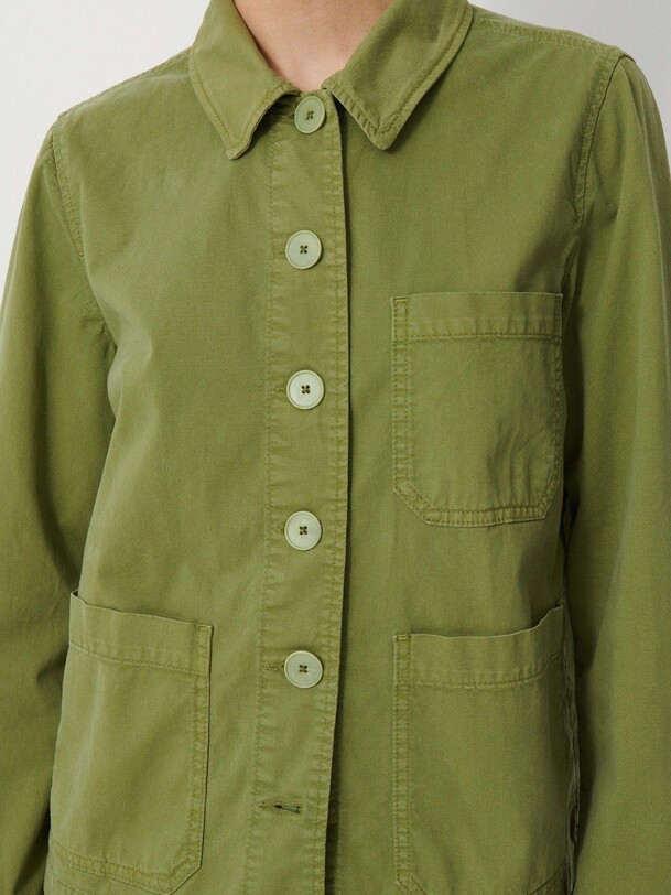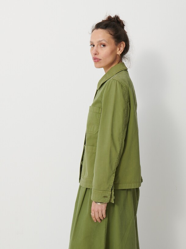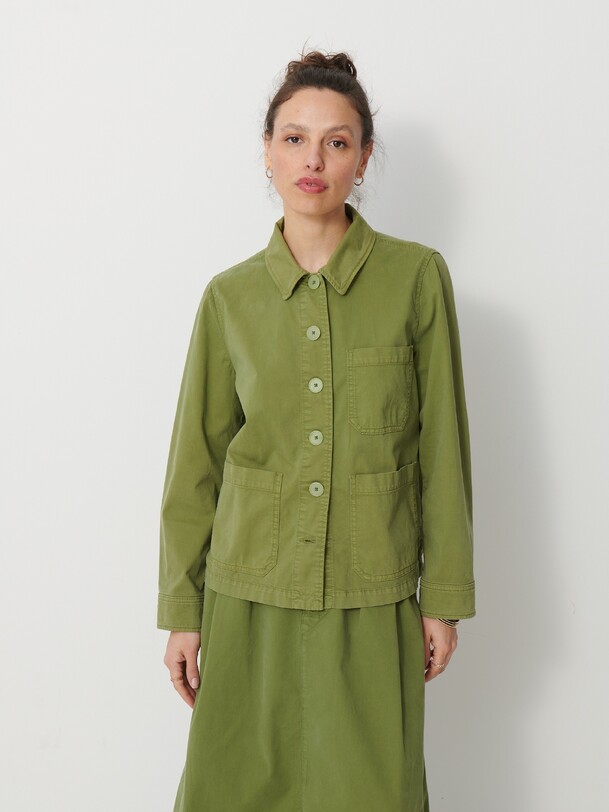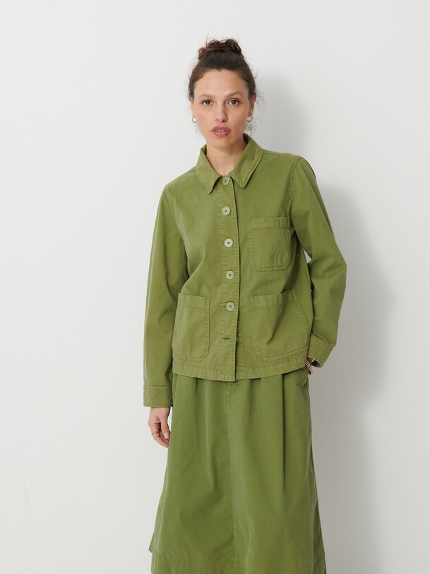 The Golta jacket features a button front, classic collar, and patch pockets. It has long sleeves with buttoned cuffs.