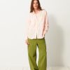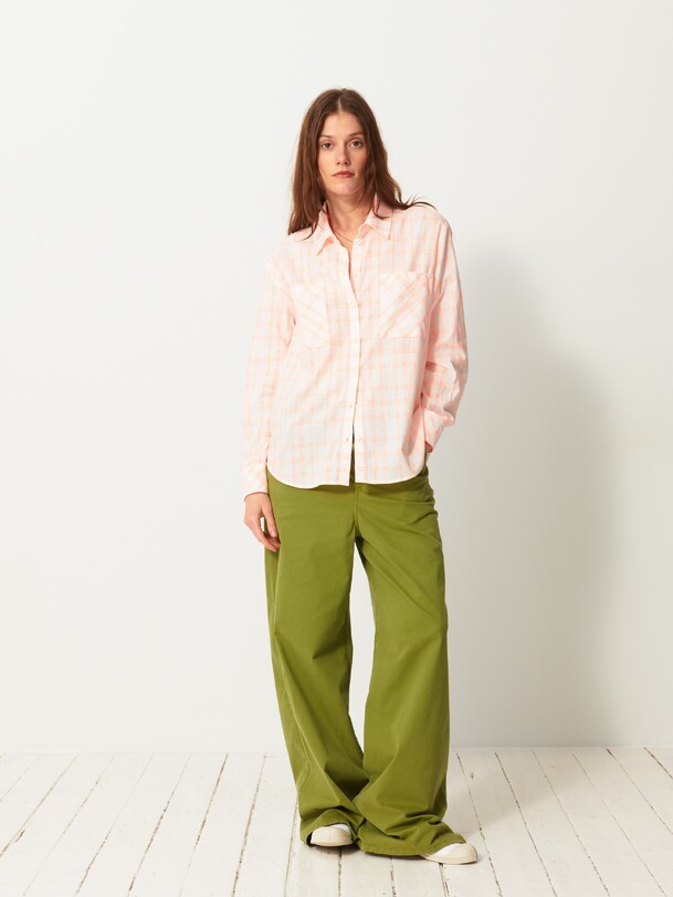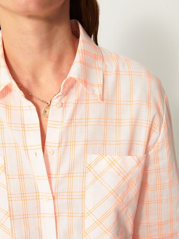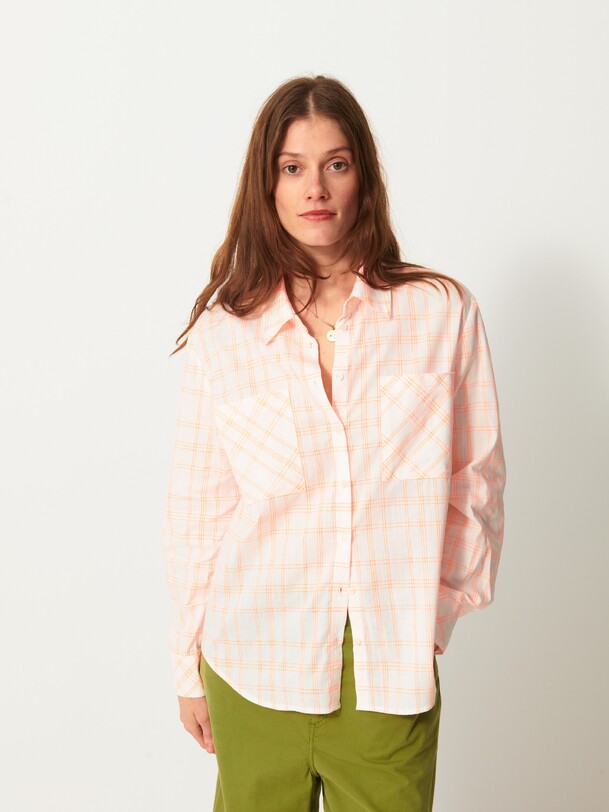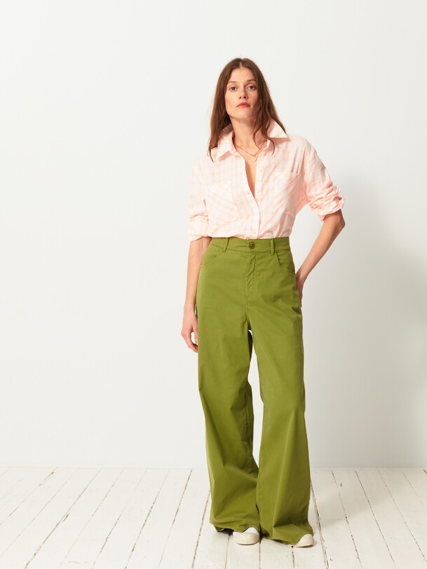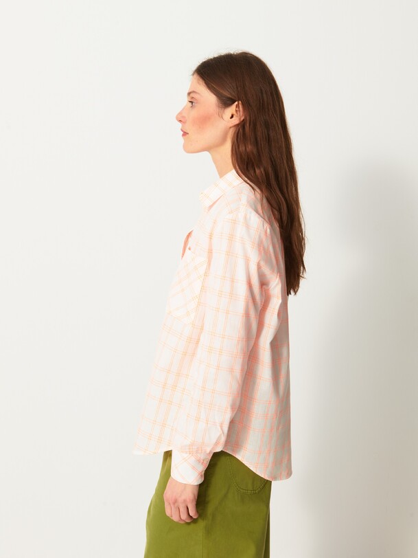 The Hilara shirt features a classic collar and a straight, long cut with a shirttail hem. It is designed with chest patch pockets and Bensimon engraved buttons.