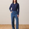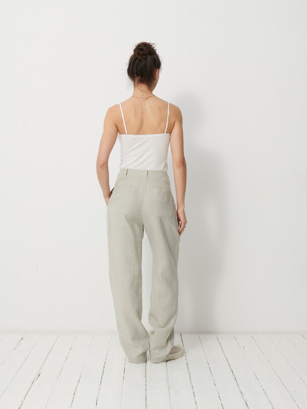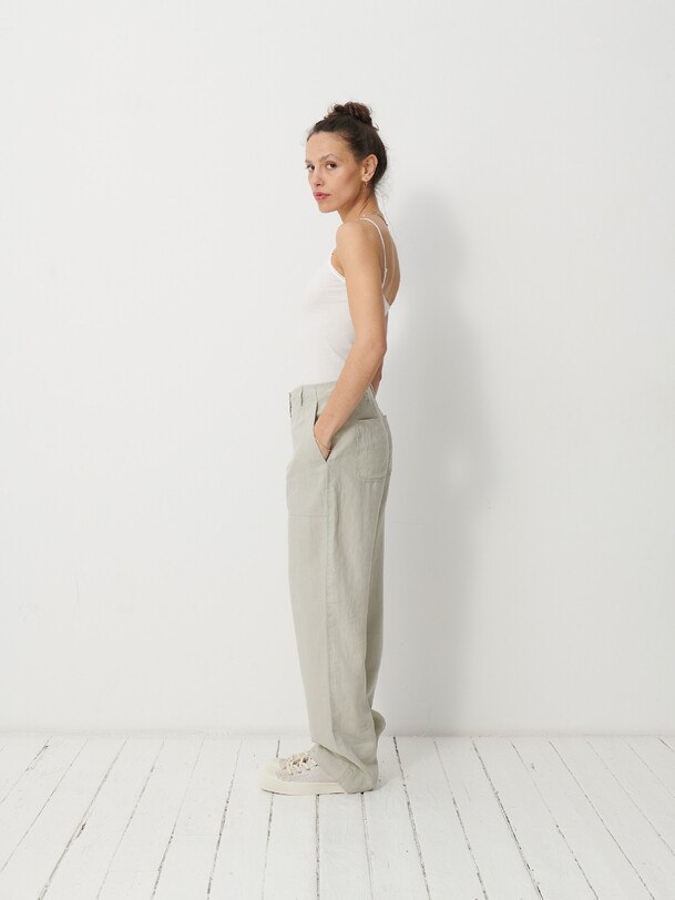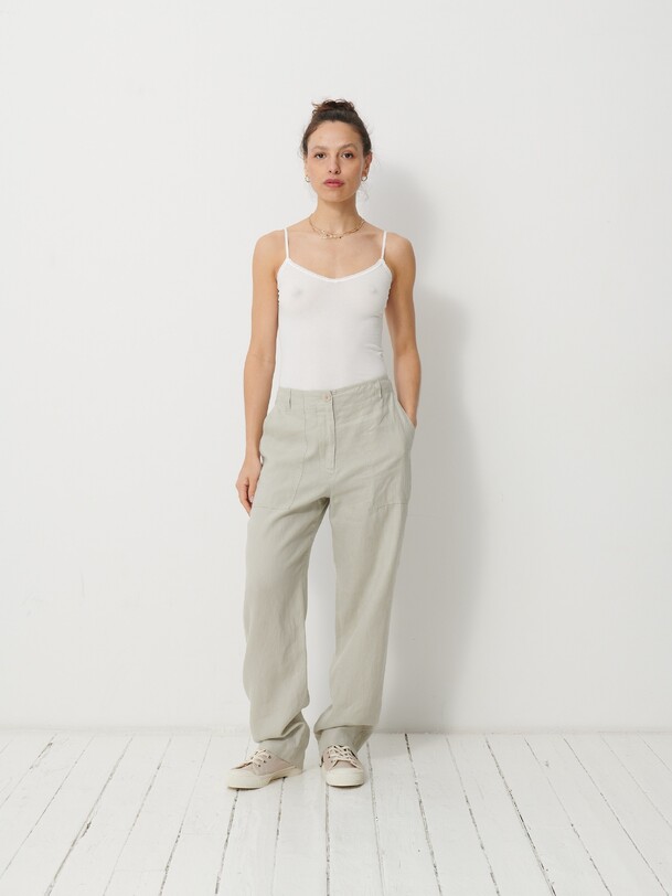 The Hugues trousers feature a straight-leg design with front patch pockets. The waistband is flat with belt loops. They have back patch pockets and a folded hem. Inspired by multi-pocket military trousers.