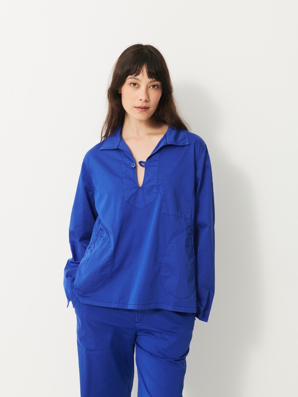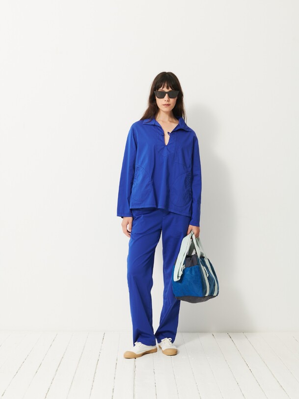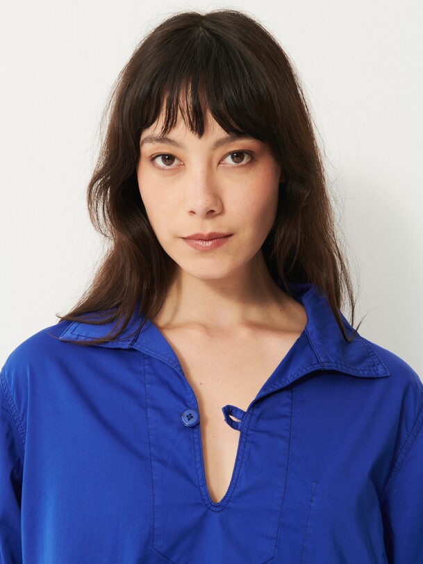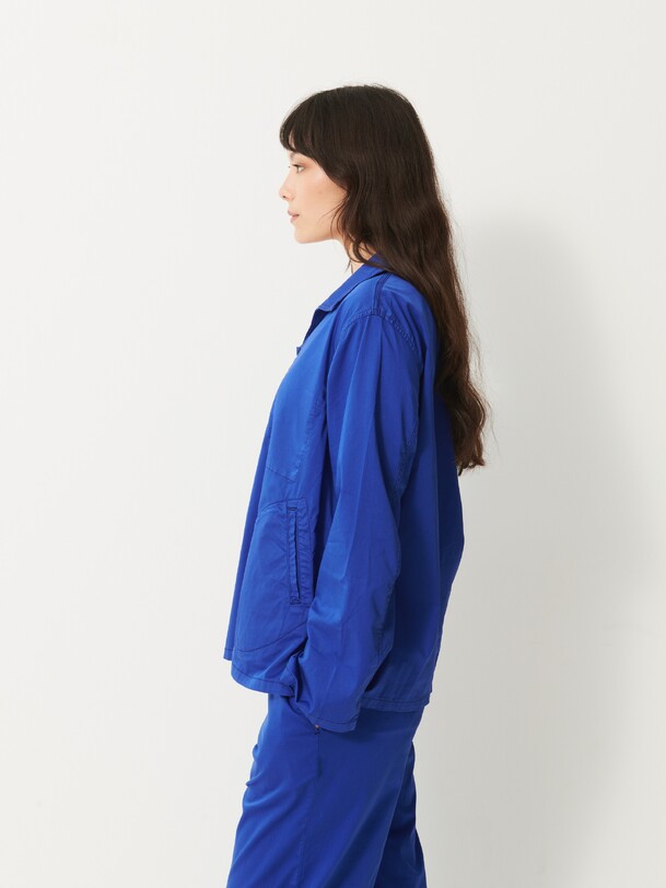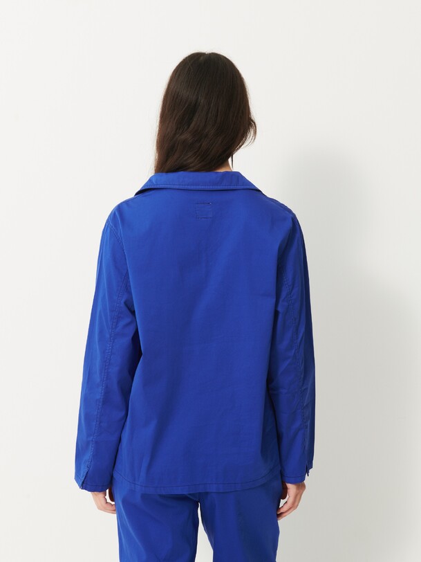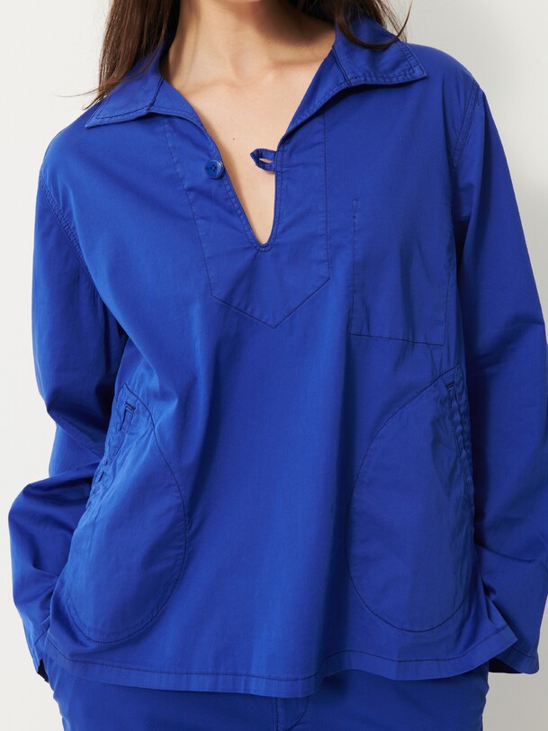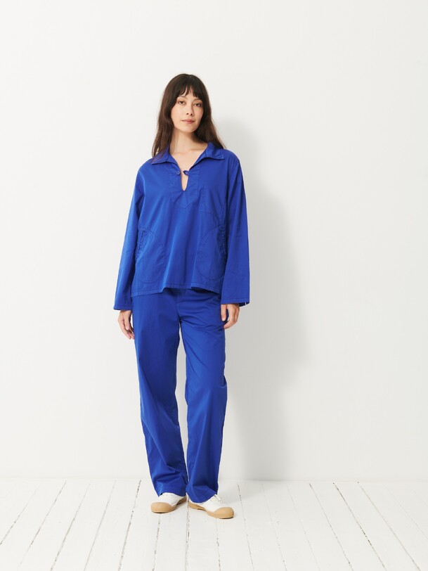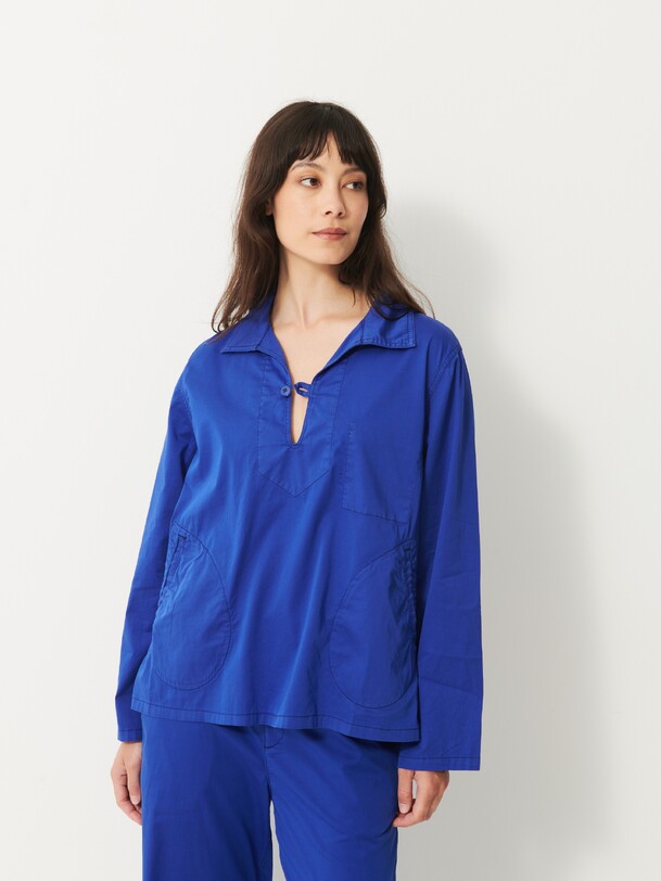 The Ignis Smock is crafted from satin gabardine. It features piped pockets adorned with topstitching that reveals the pocket lining. An inside breast pocket is also included. Inspired by the traditional sailors’ smock.