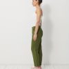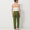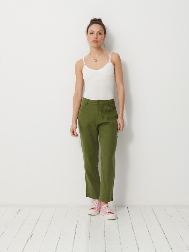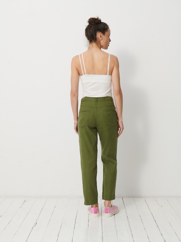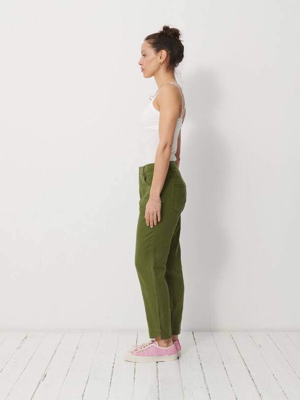 The Ipanema trousers are a pair of linen cigarette trousers featuring Italian front pockets and patch pockets at the back. They fasten with a zip fly and are equipped with a belted waist that includes belt loops.