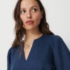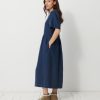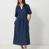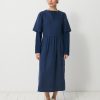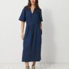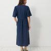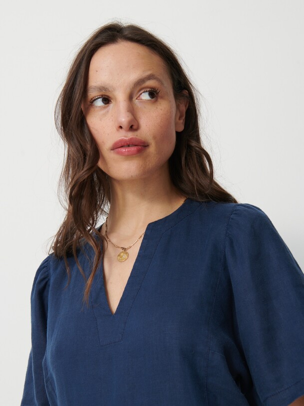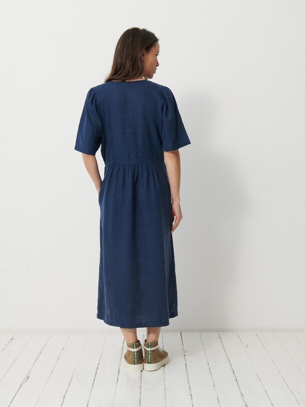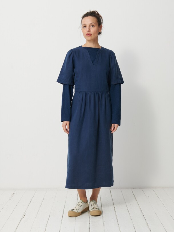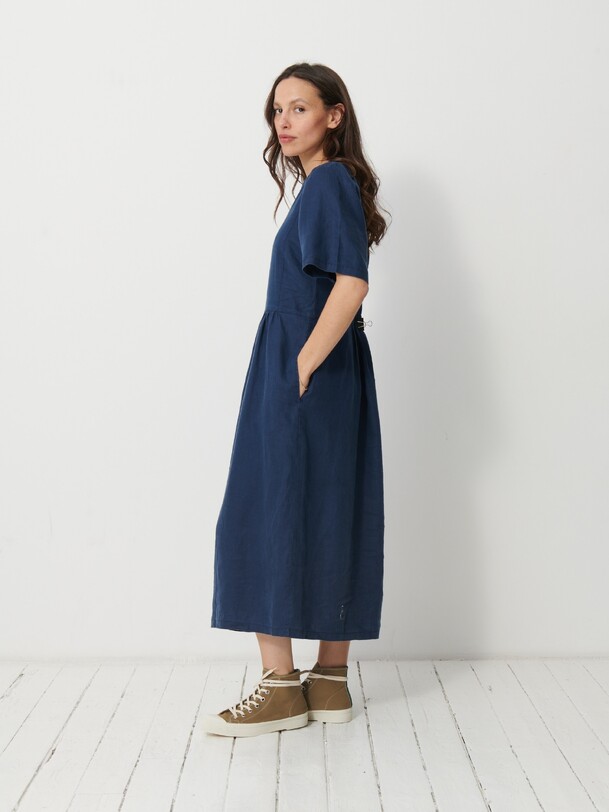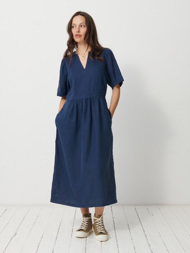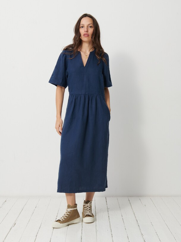 Jada Long Linen Dress. It features a V-neck and wide, half-length sleeves. Gathered at the waist for a flattering fit. Vertical seams at the armholes. Stitched hem on the sleeves and at the bottom of the dress.