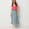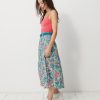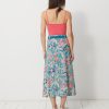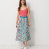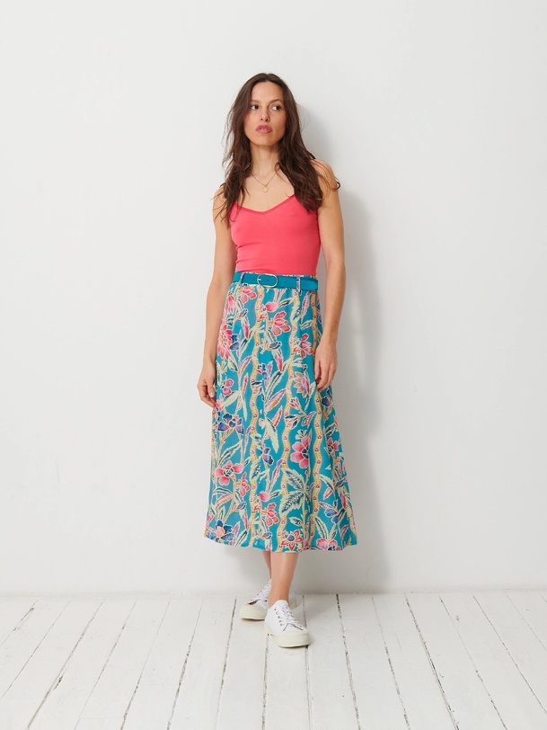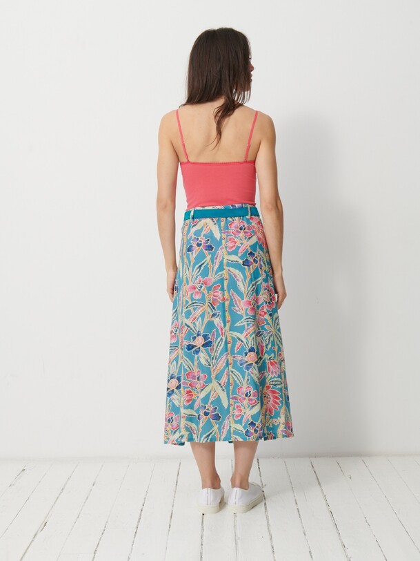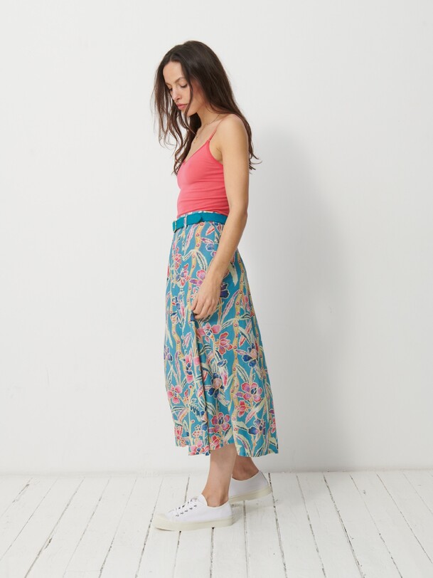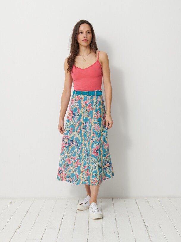 The Janna skirt is a mid-calf length, A-line printed skirt. It features an invisible side zip and comes with a belted waist featuring belt loops. The design is inspired by the long skirts of the late 70s.
