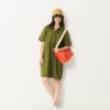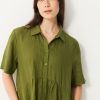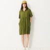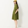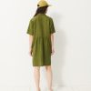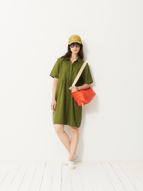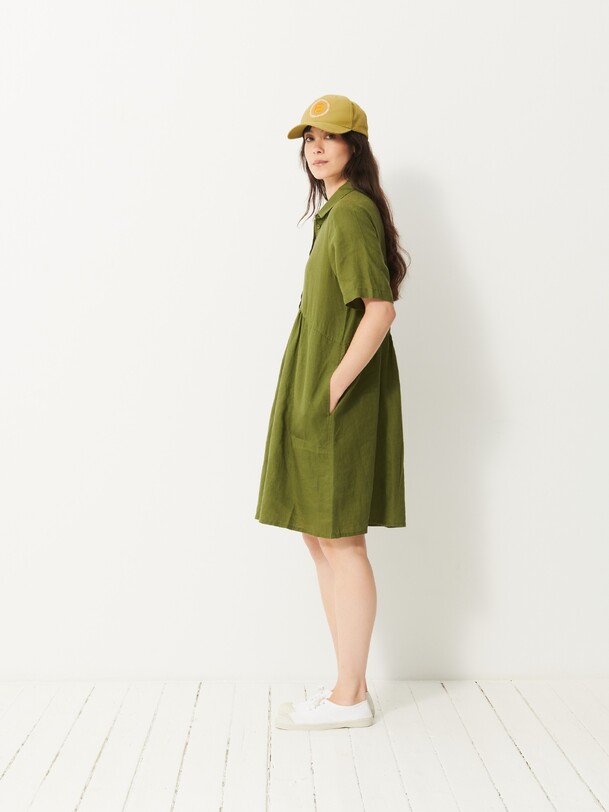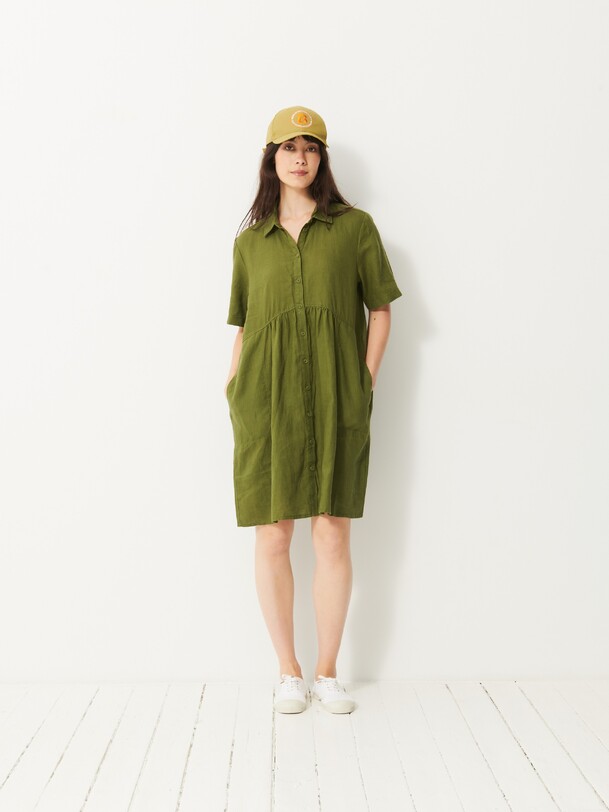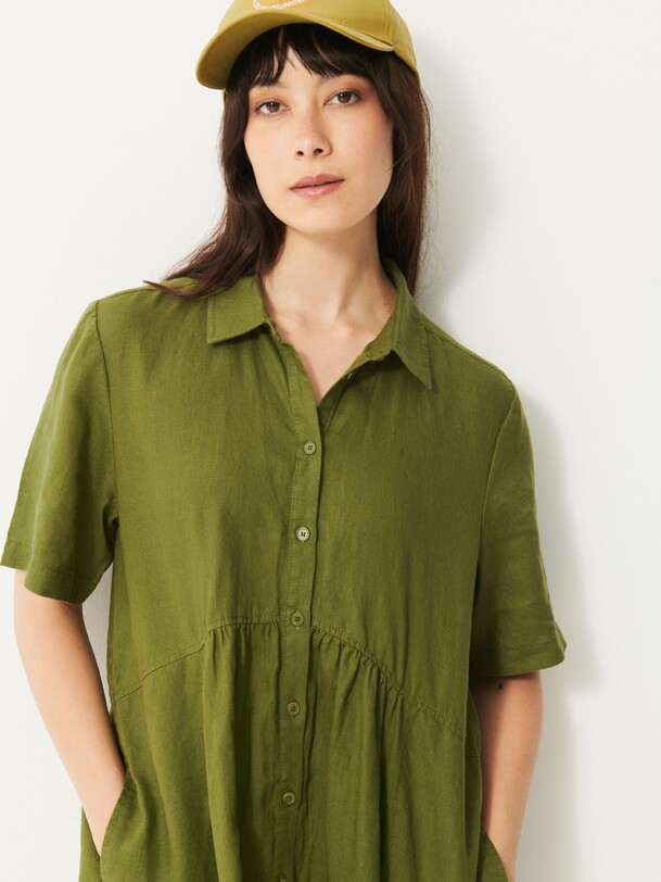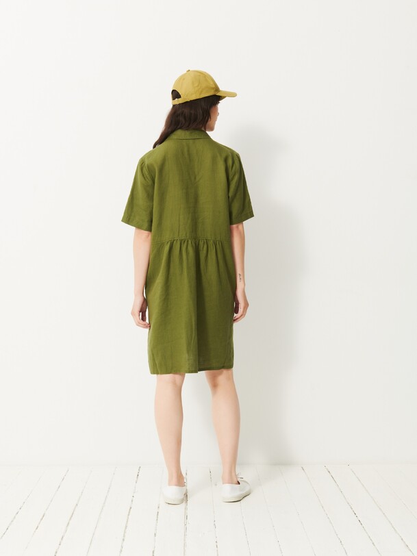 Jaya Short-Sleeve Linen Dress. A loose fit for ultimate comfort. Features a shirt collar and discreet pockets with visible stitching at the bottom. Button placket closure and delicate gathers below the waist seam.
