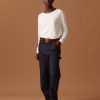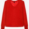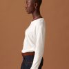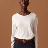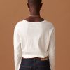 The July T-shirt is made of slub cotton with long sleeves. It has a boxy fit and a round neckline with topstitched detailing. The hem is topstitched at the bottom and cuffs. The neckline is finished in a contrasting color.