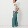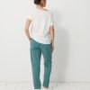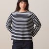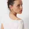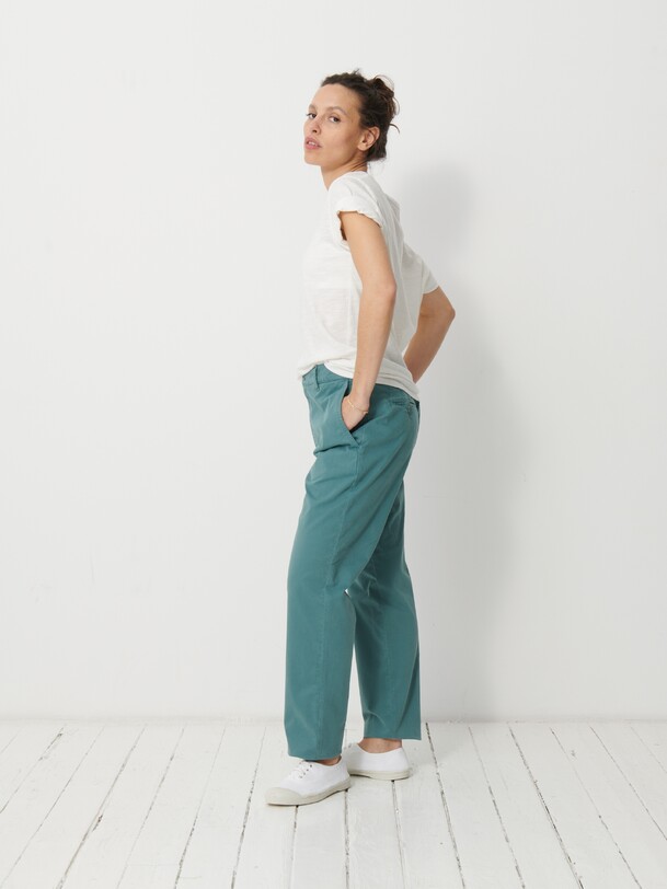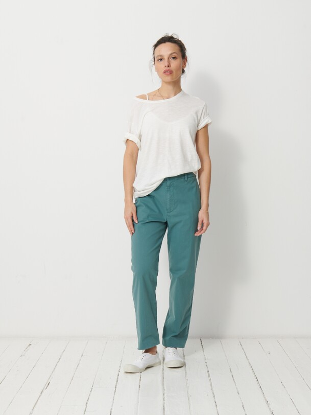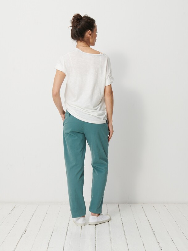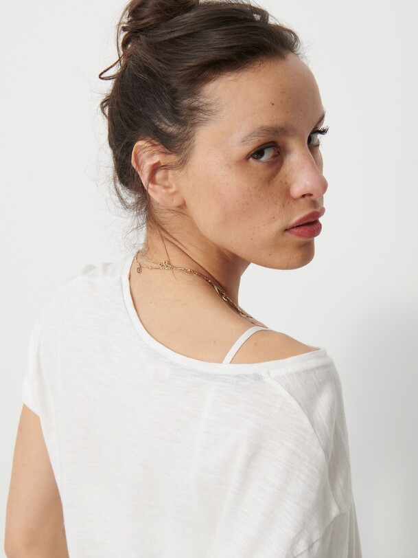 The July t-shirt is made from slub cotton with short sleeves. It features a boxy cut and a round neckline with neat topstitching. The hem is topstitched at the bottom and at the sleeve ends. The very edge of the neckline is finished in a contrasting colour.