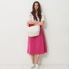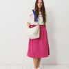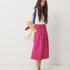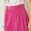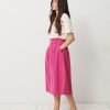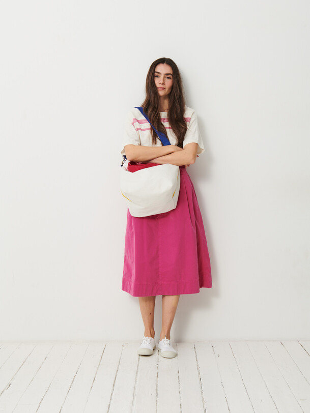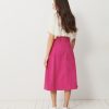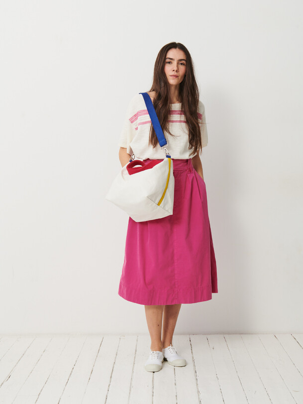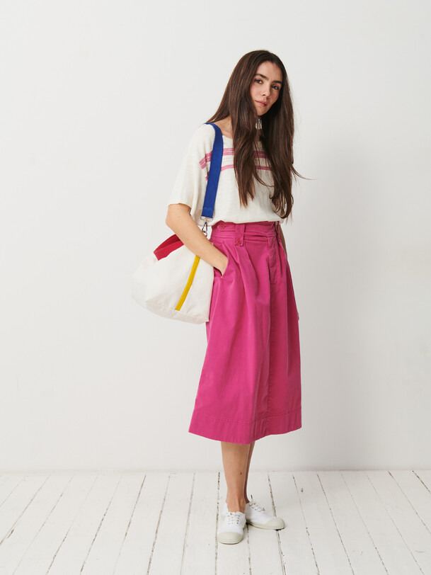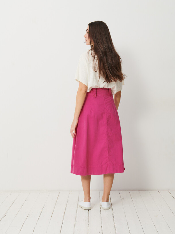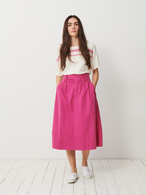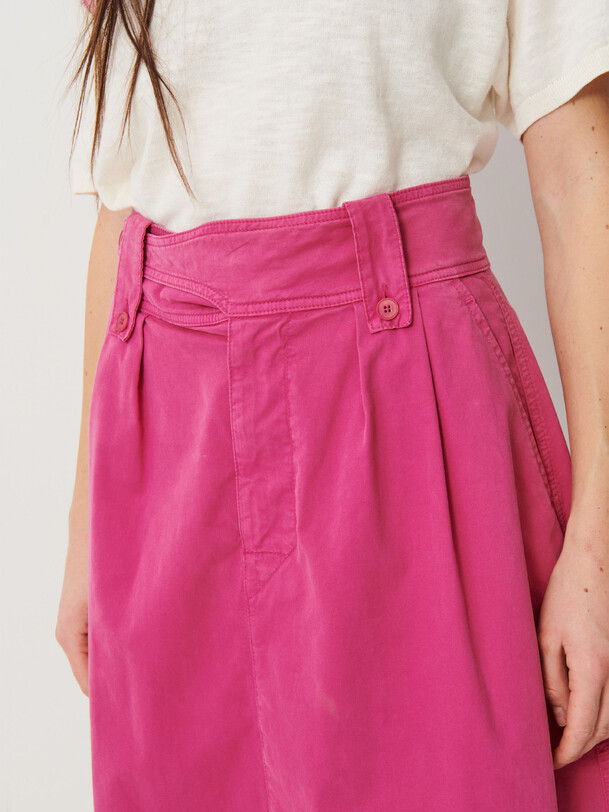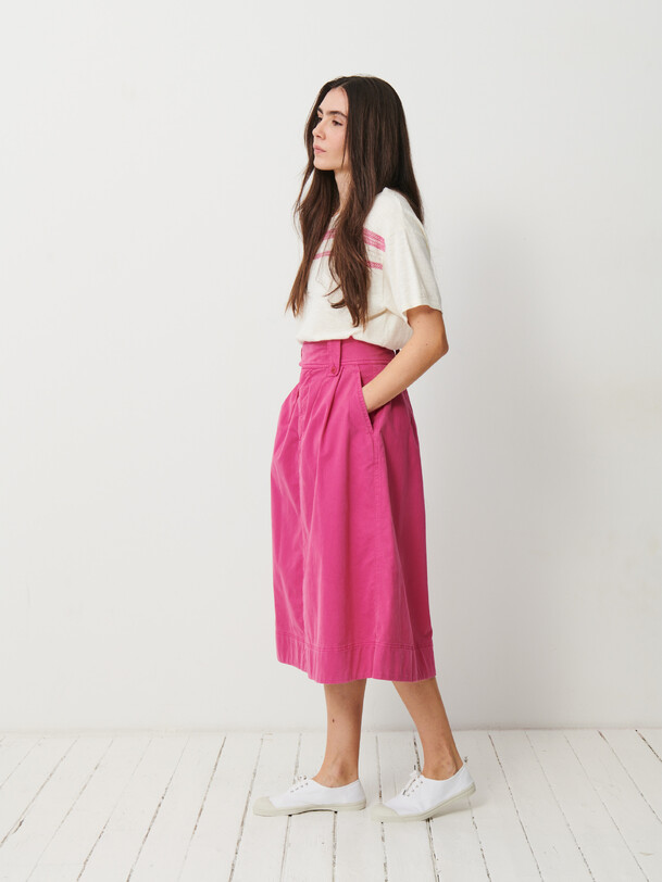 The Klea skirt is a flared gabardine skirt featuring a fly front and side slash pockets. It has an adjustable buttoned waistband with buttoned belt loops. Pleats are added to the front with darts at the back. Its hem is topstitched at the bottom.