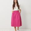 The Klea skirt is a flared gabardine skirt featuring a fly front and side slash pockets. It has an adjustable buttoned waistband with buttoned belt loops. Pleats are added to the front with darts at the back. Its hem is topstitched at the bottom.