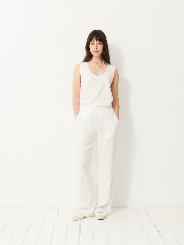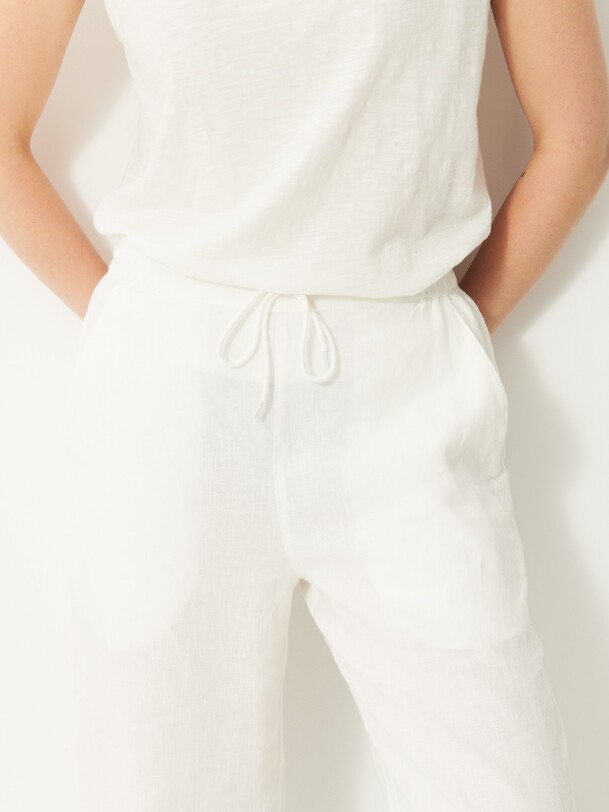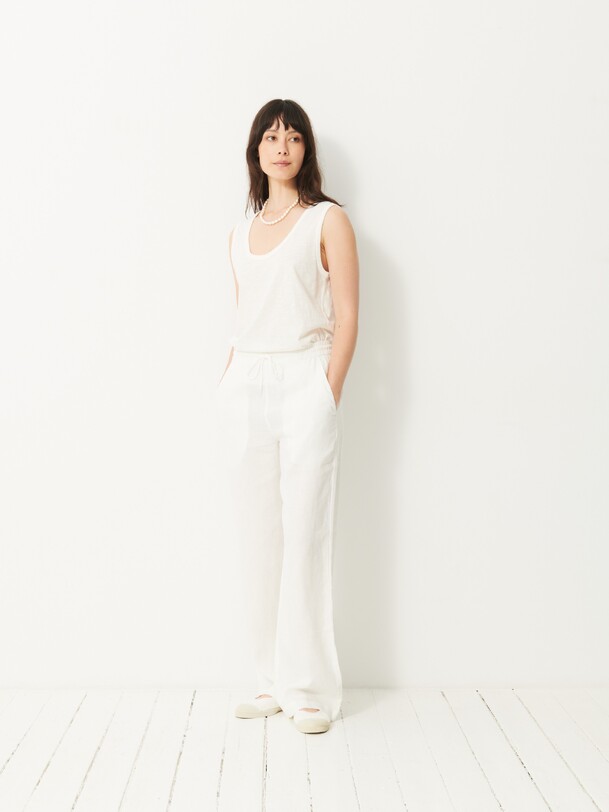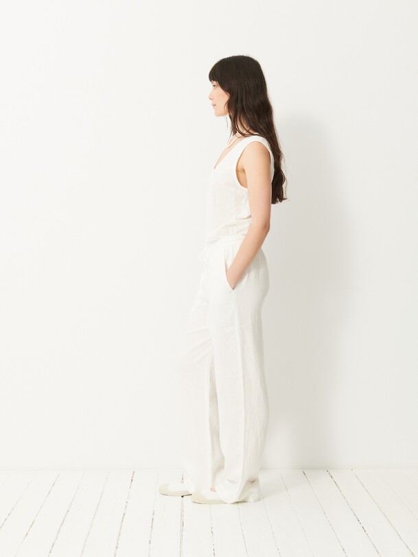 The Kybele trousers are long and straight. They feature an elasticated waistband at the back and a drawstring in matching cotton.