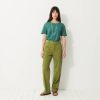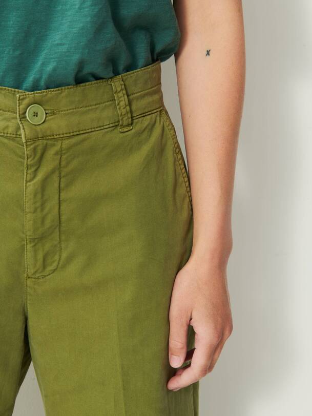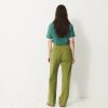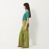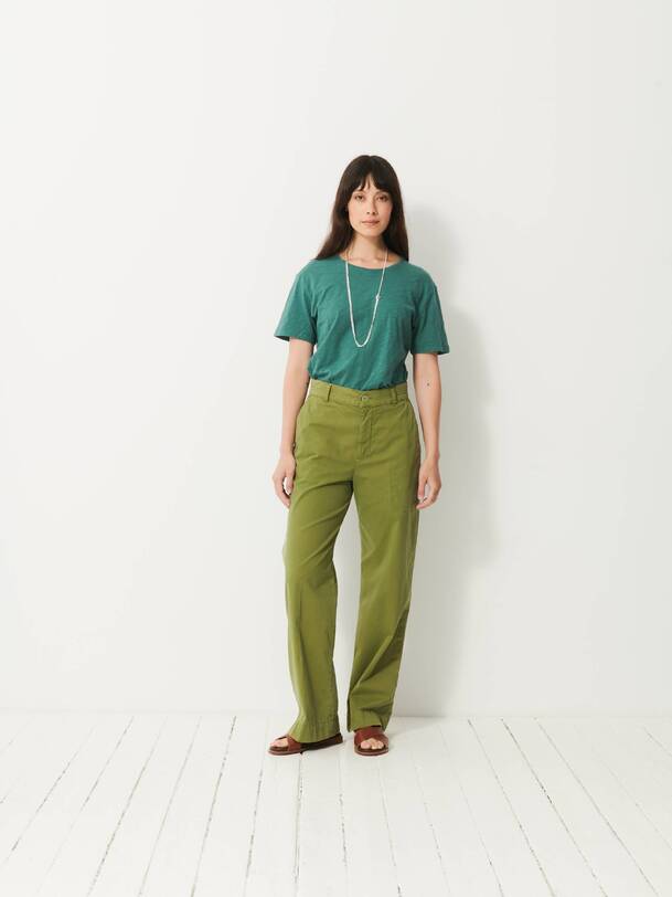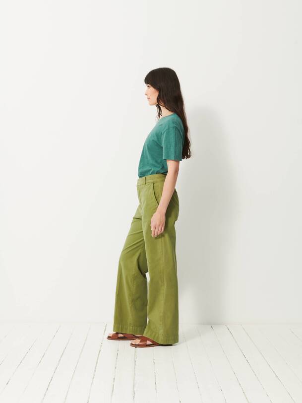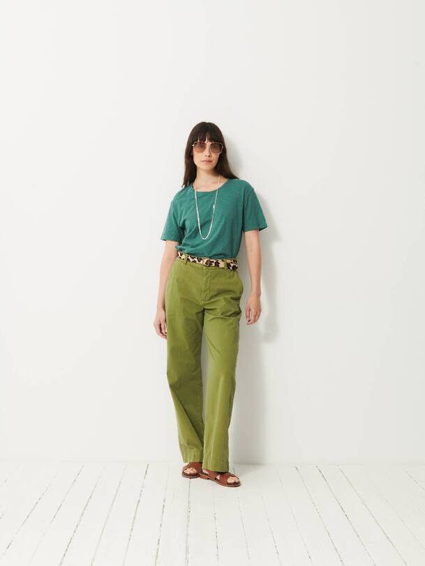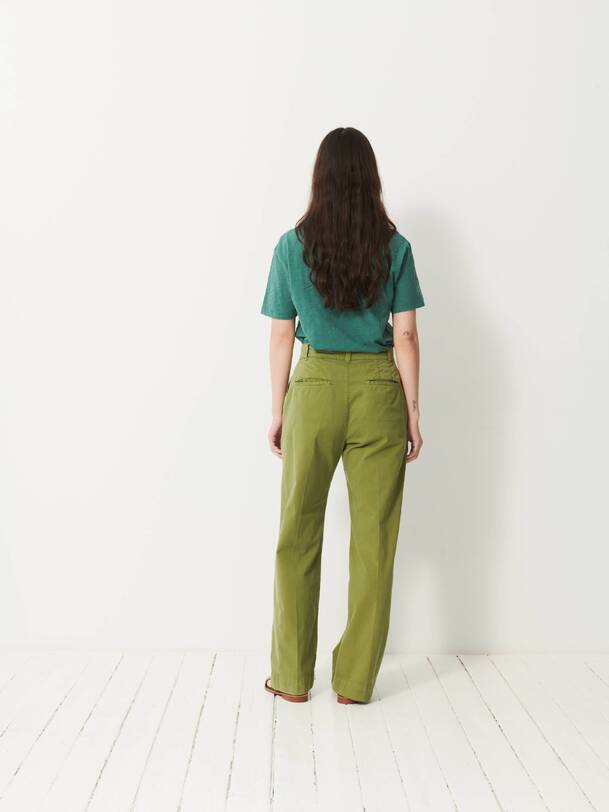 The Dama trousers are wide-leg in gabardine. They feature a high waist with a straight belt. The front pockets are Italian style, while the back pockets are welted. Its design is inspired by the 70s, with a long and sleek silhouette.