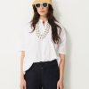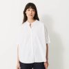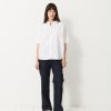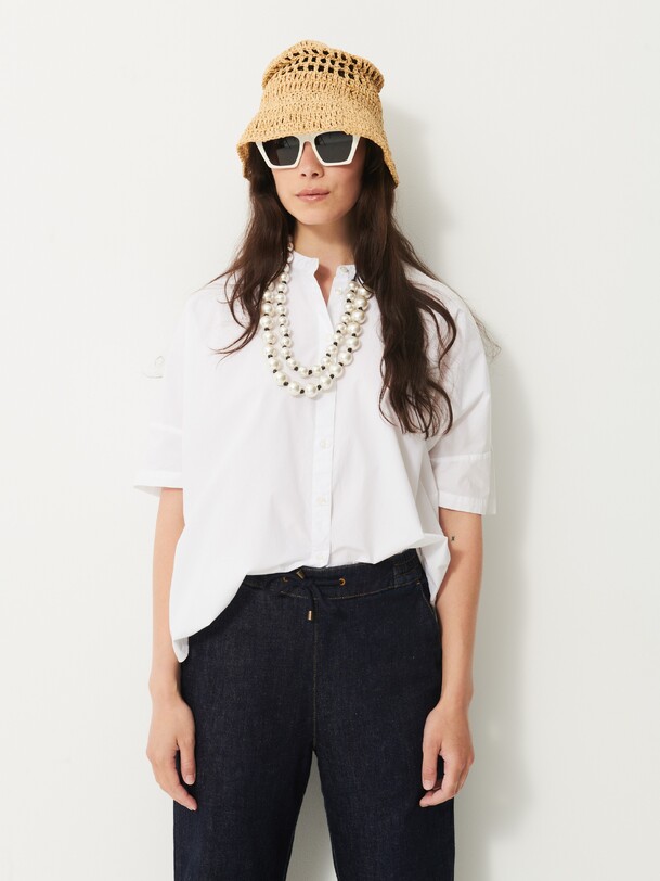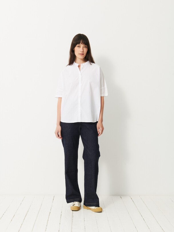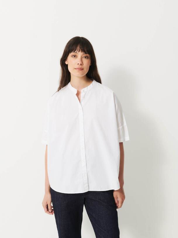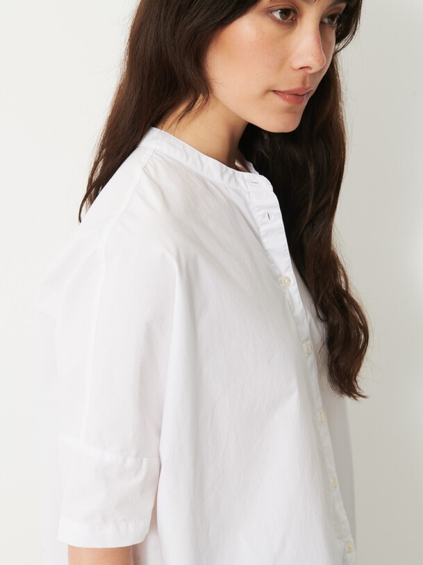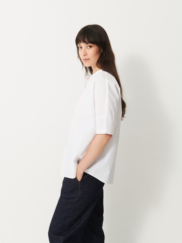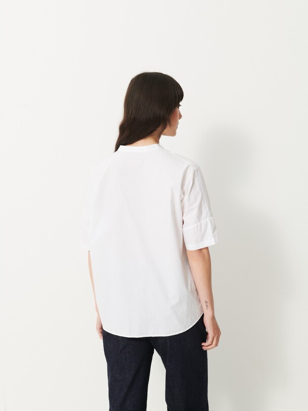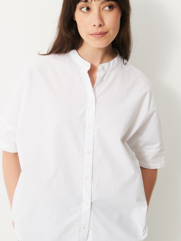 The Lanica blouse is a cotton poplin shirt offering a straight and loose fit. It features a stand collar and a button placket at the front, with short sleeves.