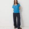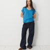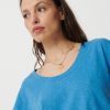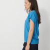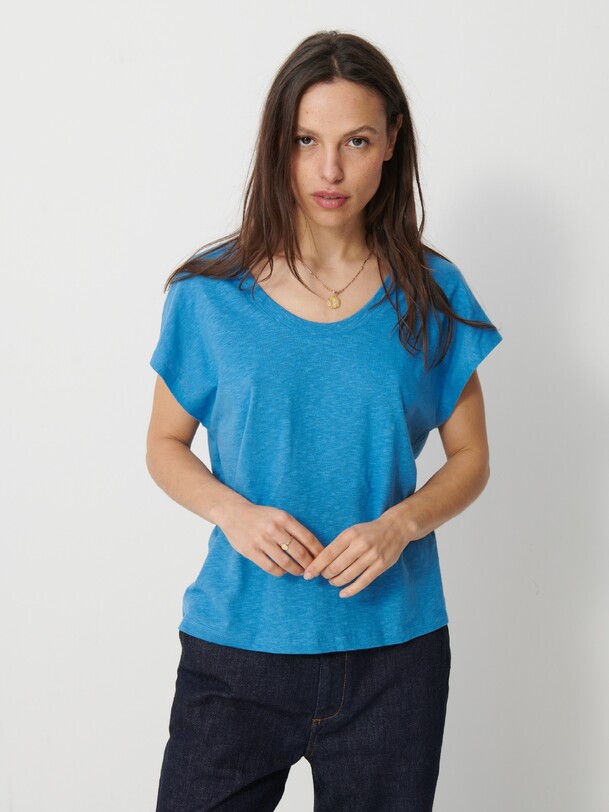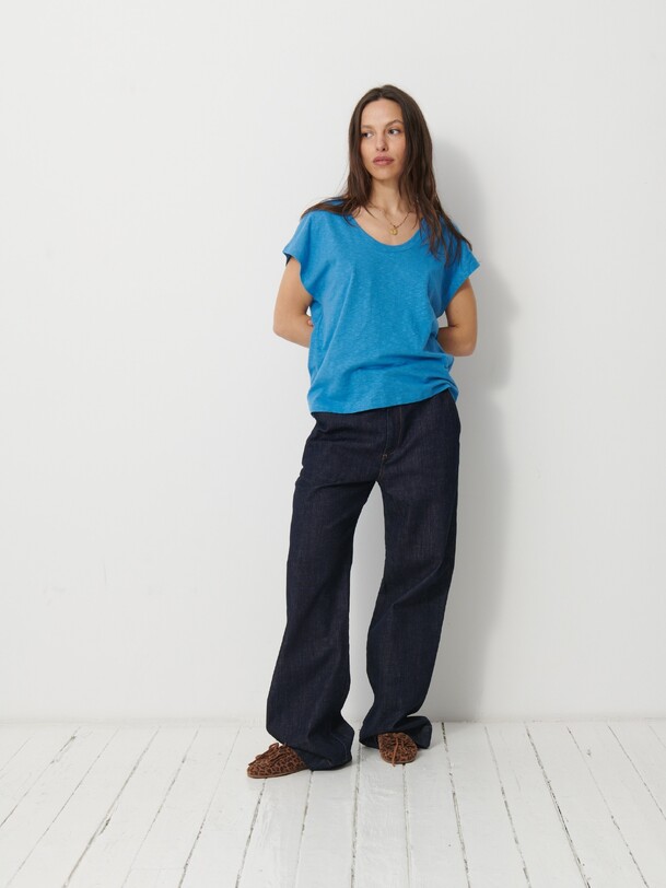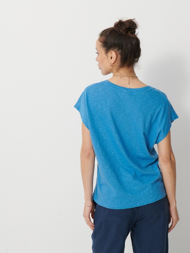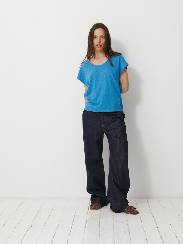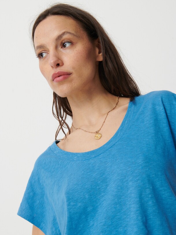 The Luciana T-shirt is a sleeveless design made from slub cotton-linen. It features a round neckline with a ribbed trim.