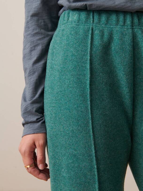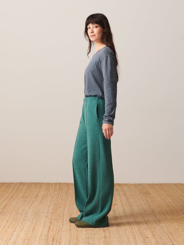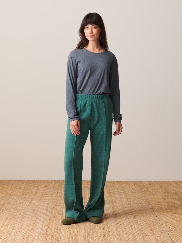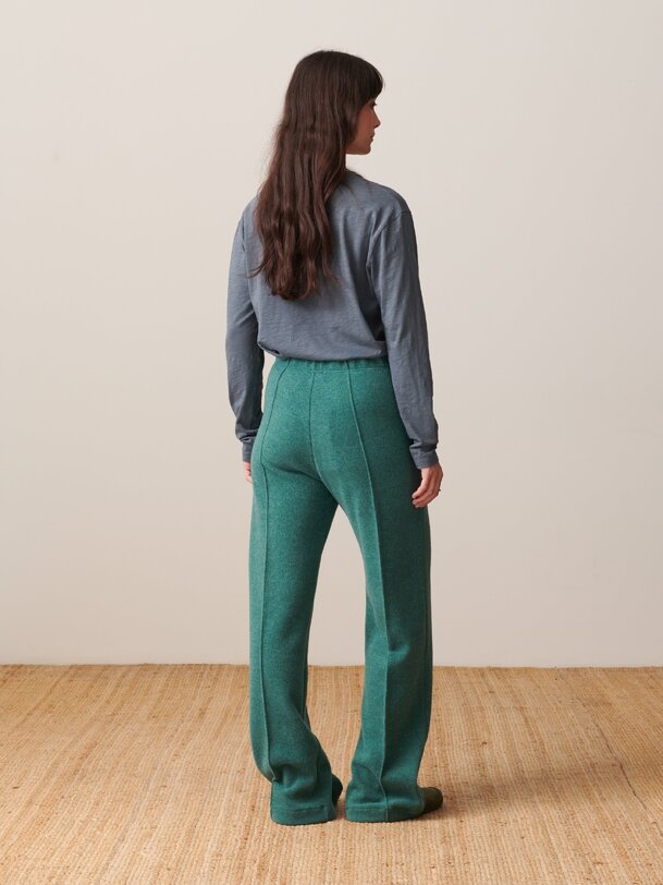 A trouser that favours comfort without sacrificing elegance. Knitted in double-face knit, the Luckylon is soft on the inside and provides enveloping warmth. Its high, snug waistband naturally defines the waist, while the long, straight leg lengthens the silhouette. Discreet side pockets set into the seams add practicality without weighing down the line. Easy to pair — a lightweight jumper, a structured jacket or sneakers — it embodies everyday softness with an impeccable look.