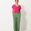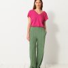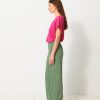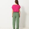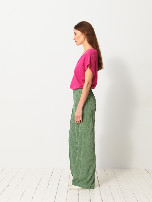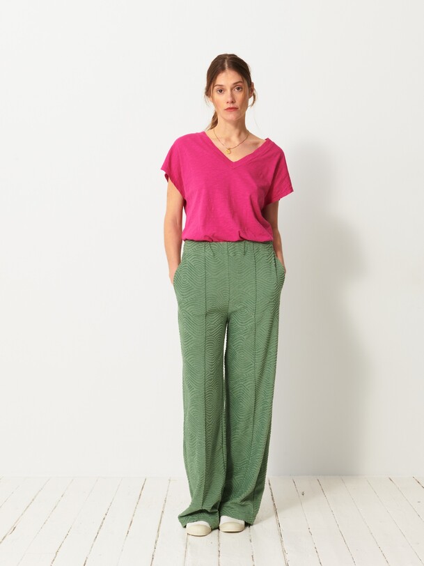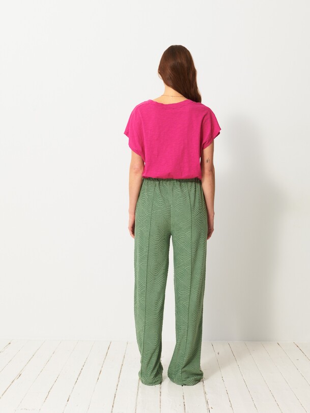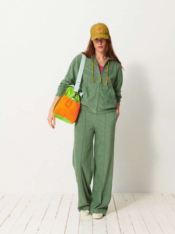 Luckylon towelling trousers with integrated belt. Features sharply pressed creases at the front and back. The pockets are piped with side stitching.