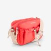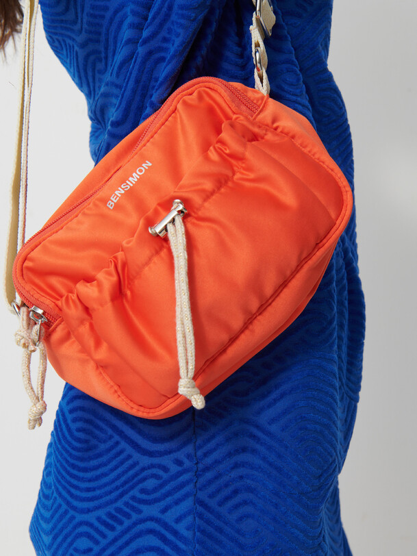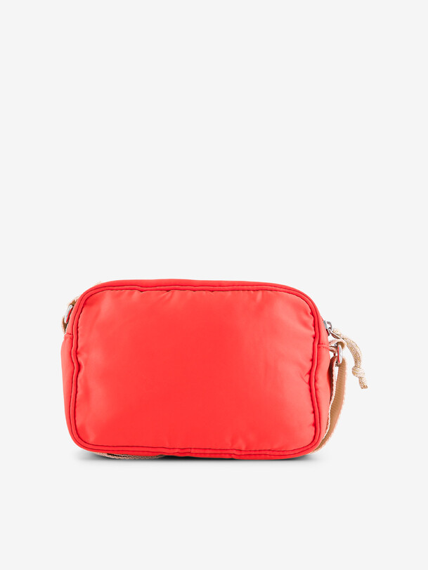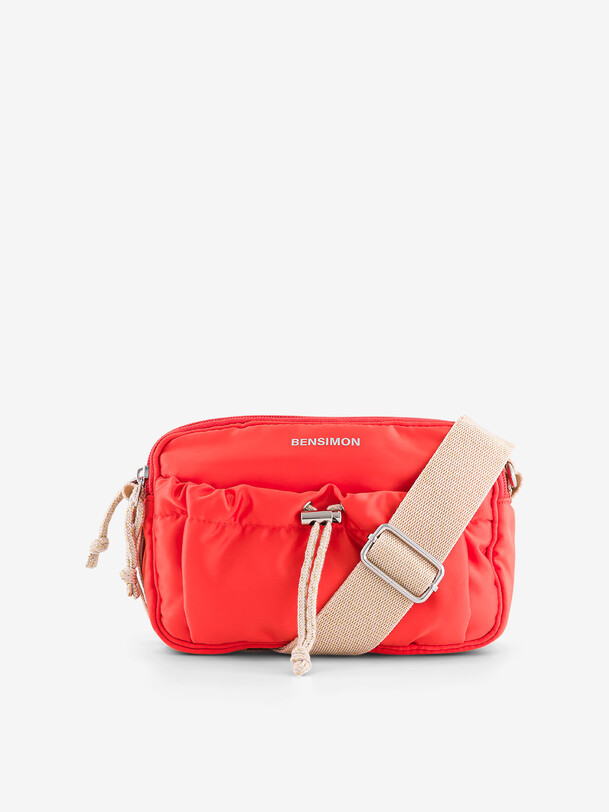 Small Madras bag with a compact capacity. It features two zippered storage pockets, a front pocket with drawstrings, and an interior zippered pocket. The handle is adjustable for a comfortable carry. Its zipper closure secures the bag. Dimensions: 20 cm long, 5.5 cm wide, and 14 cm high.