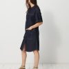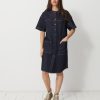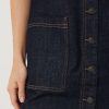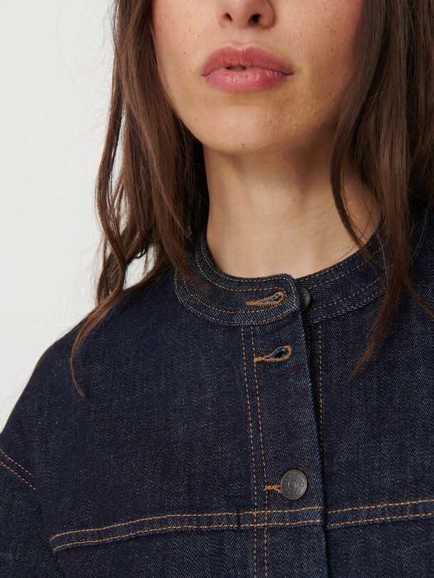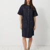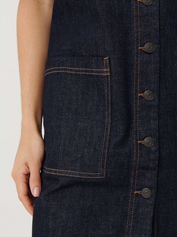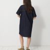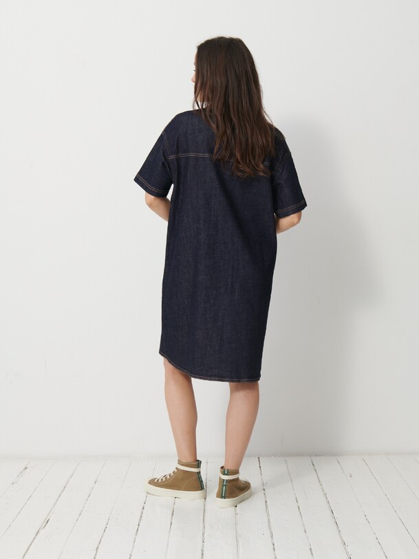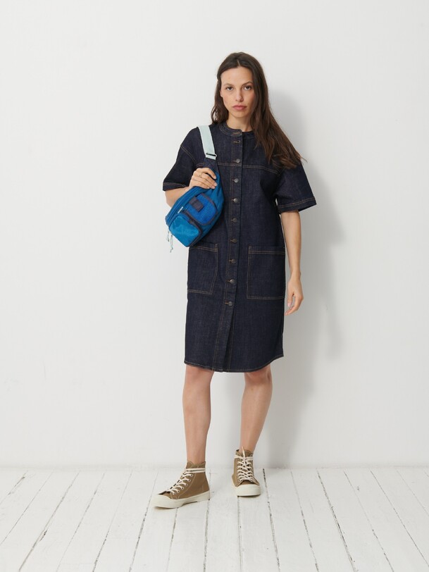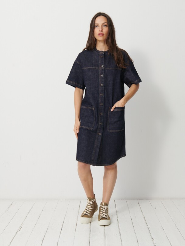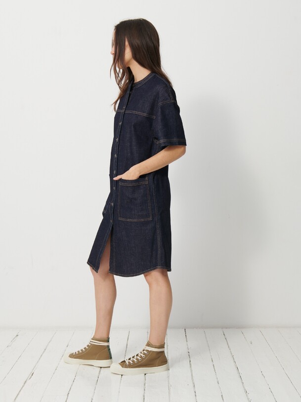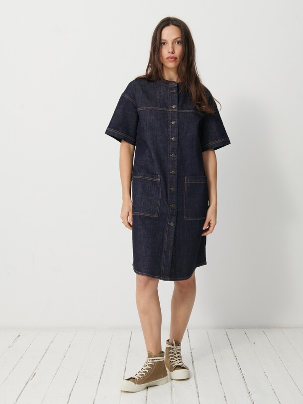 The Marthe dress is crafted in raw denim and features a mandarin collar. It boasts a loose fit and short sleeves. The pockets are patch-style on the front. Its length sits above the knee.
