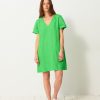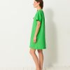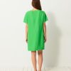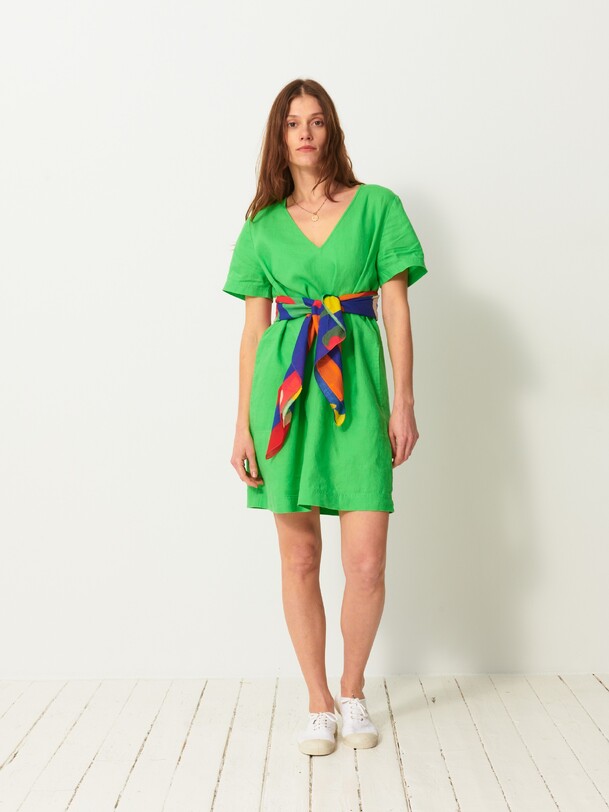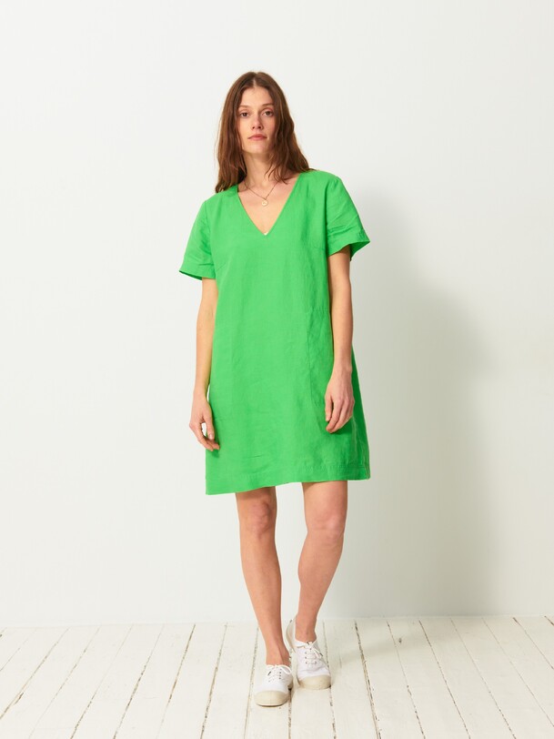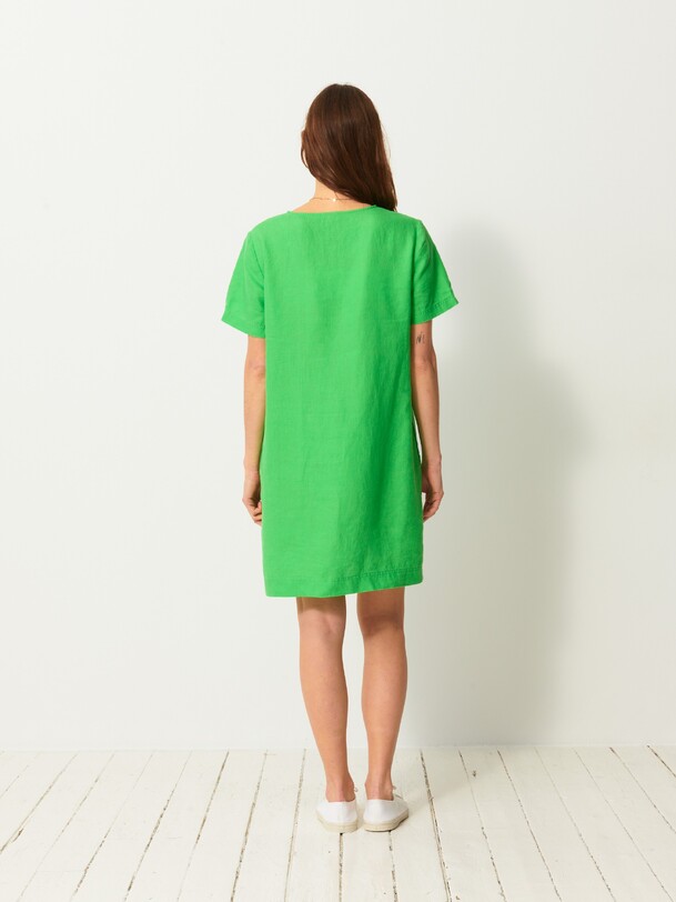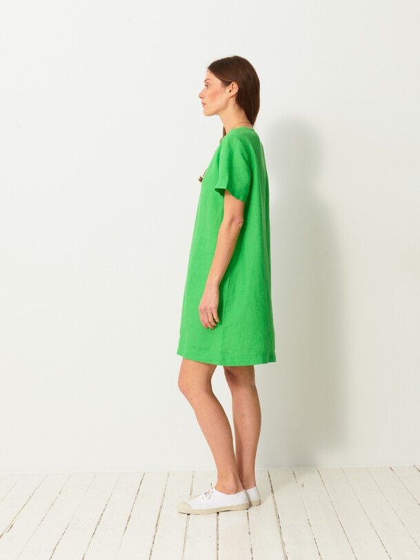The Martine dress is a short linen dress. It features a straight cut and a V-neck. Equipped with bust darts and short sleeves, it also includes side welt pockets with a stitched pocket lining.