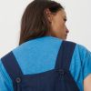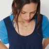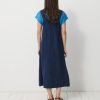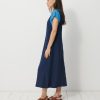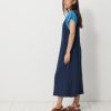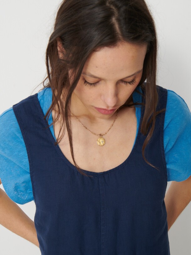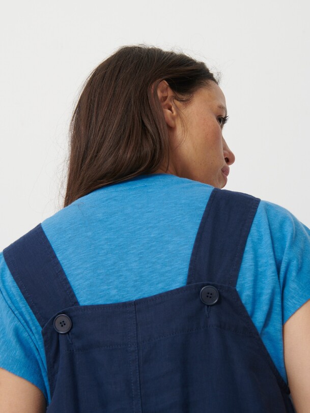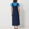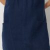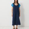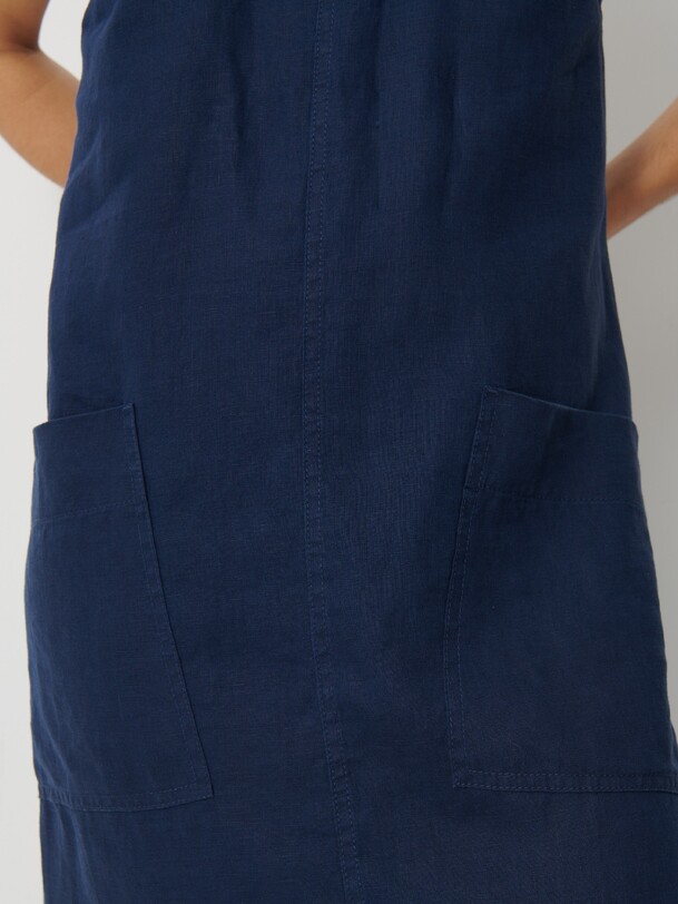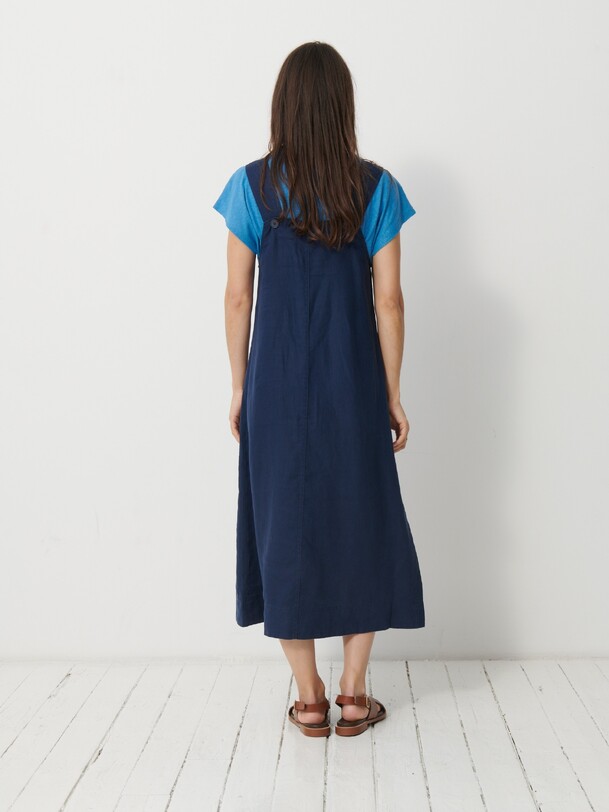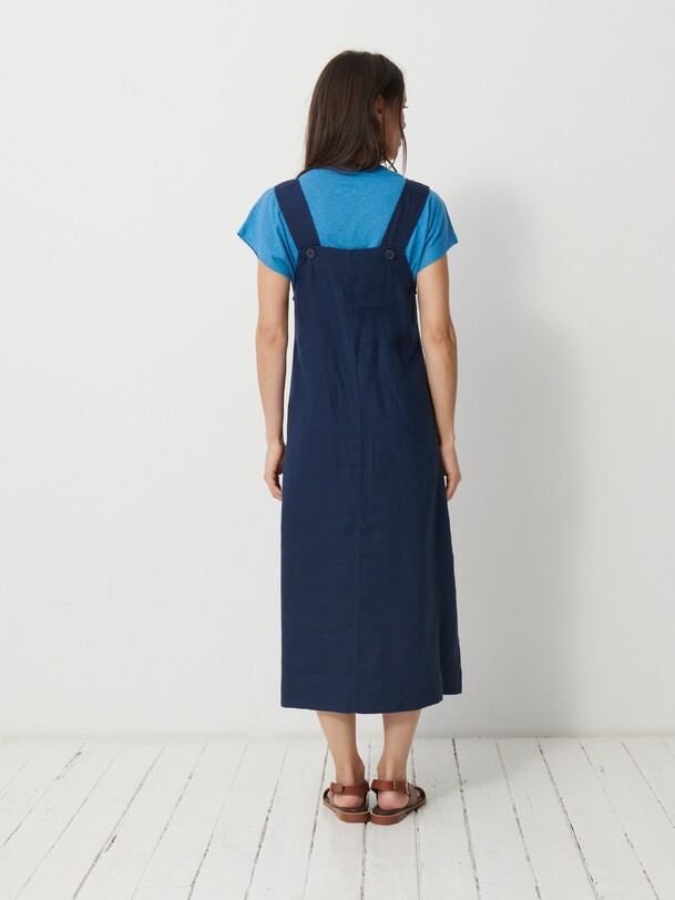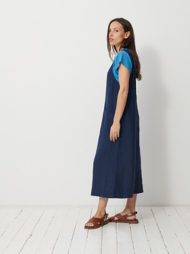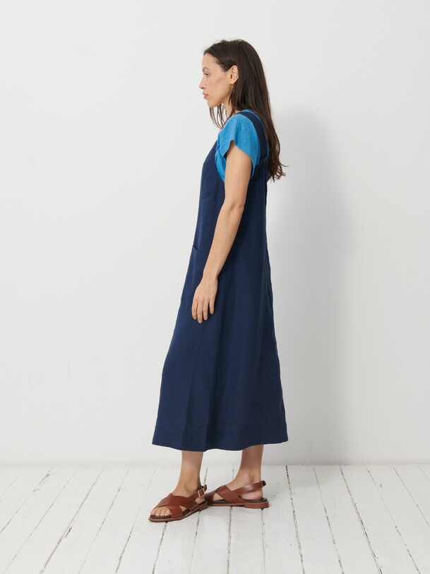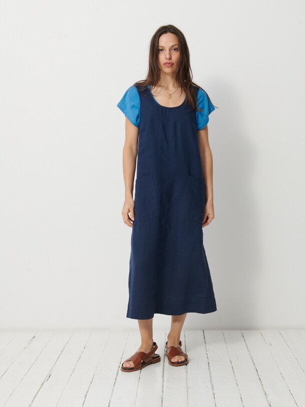 The Nadine dress is a sleeveless linen piece with a round neckline featuring a stitched centre cut at both the front and back. It boasts stitched patch pockets. The wide straps are adjustable with buttons at the back.