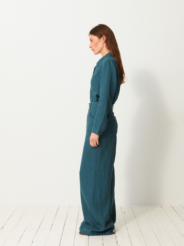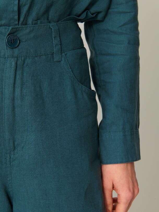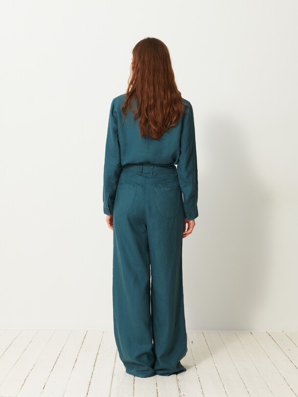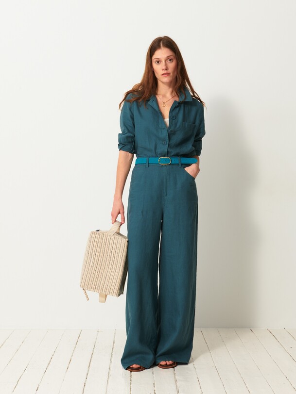 The Nelsy trousers feature a wide leg design. They are equipped with Italian pockets at the front and patch pockets at the back. A raised seam detail enhances the rear, and they have belt loops at the waist.