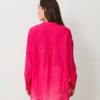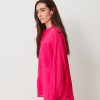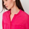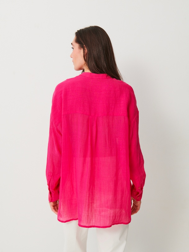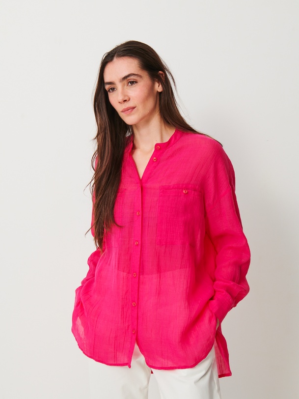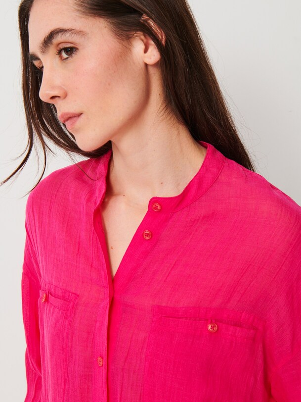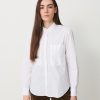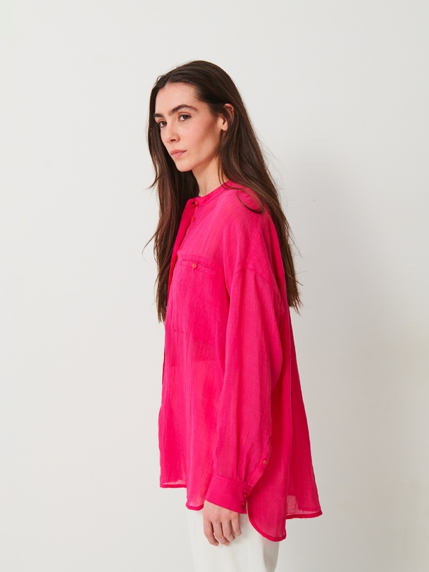 The Nicolle shirt features a masculine cut, distinguished by its fluid fabric that feminizes the silhouette. It features a stand collar and a shirt-tail hem with a longer back than front, and side slits. The two chest patch pockets are piped with visible topstitching at the bottom of the pocket and are closed with a shank button.