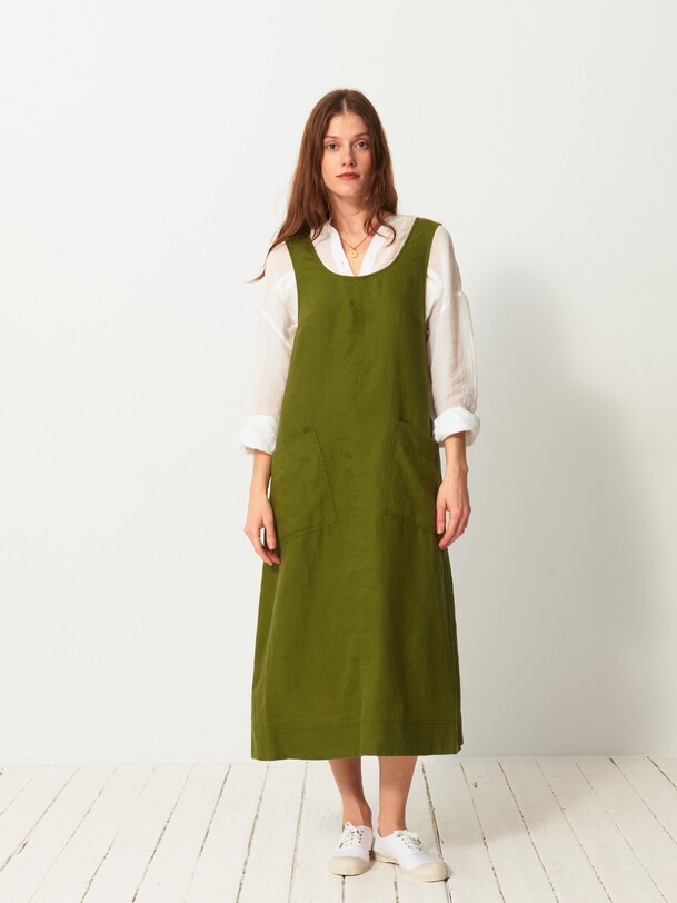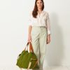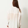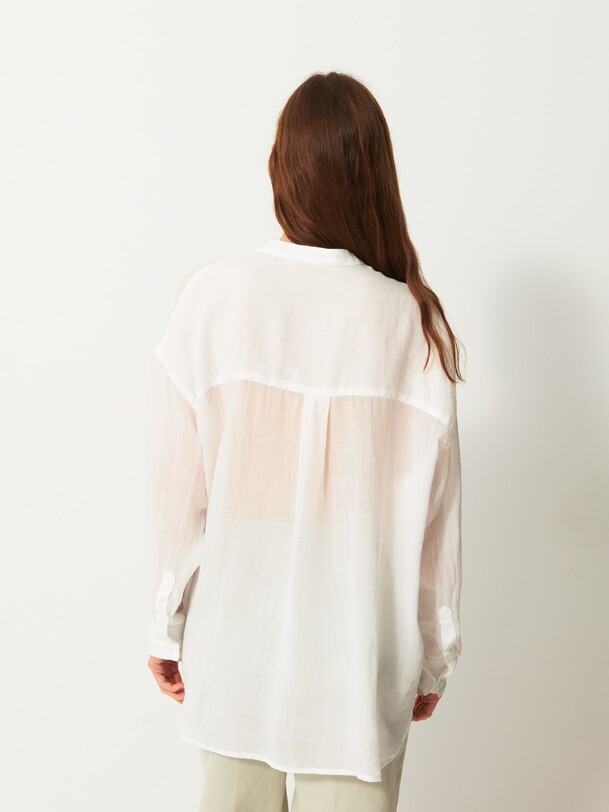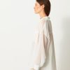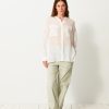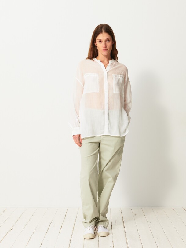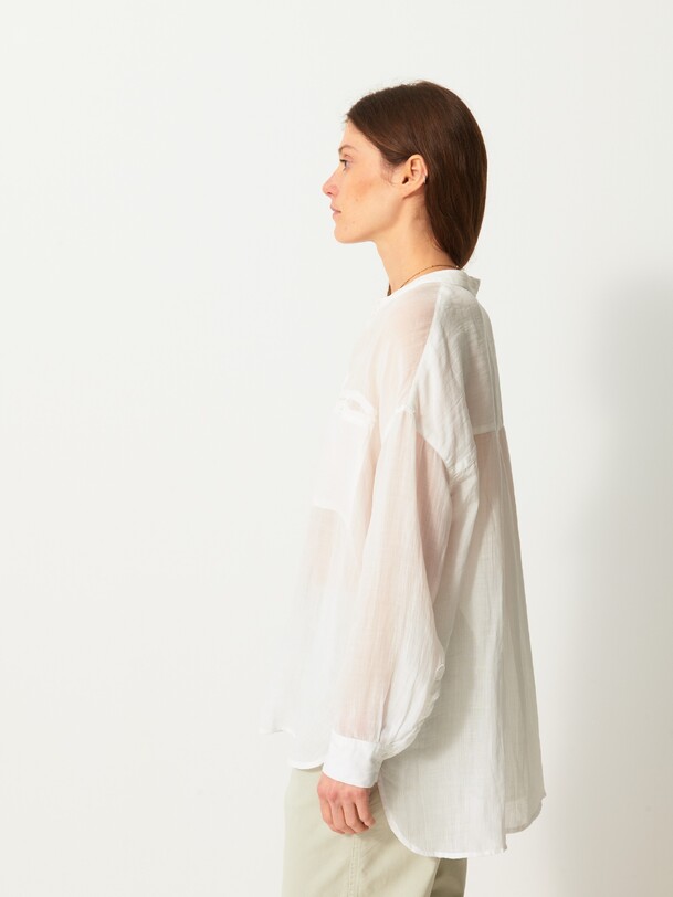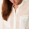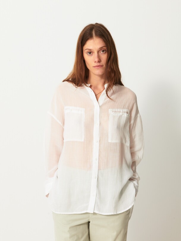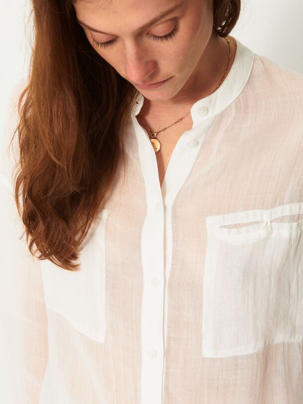 The Nicolle shirt features a masculine cut, distinguished by its fluid fabric that feminizes the silhouette. It features a stand collar and a shirt-tail hem with a longer back than front, and side slits. The two chest patch pockets are piped with visible topstitching at the bottom of the pocket and are closed with a shank button.