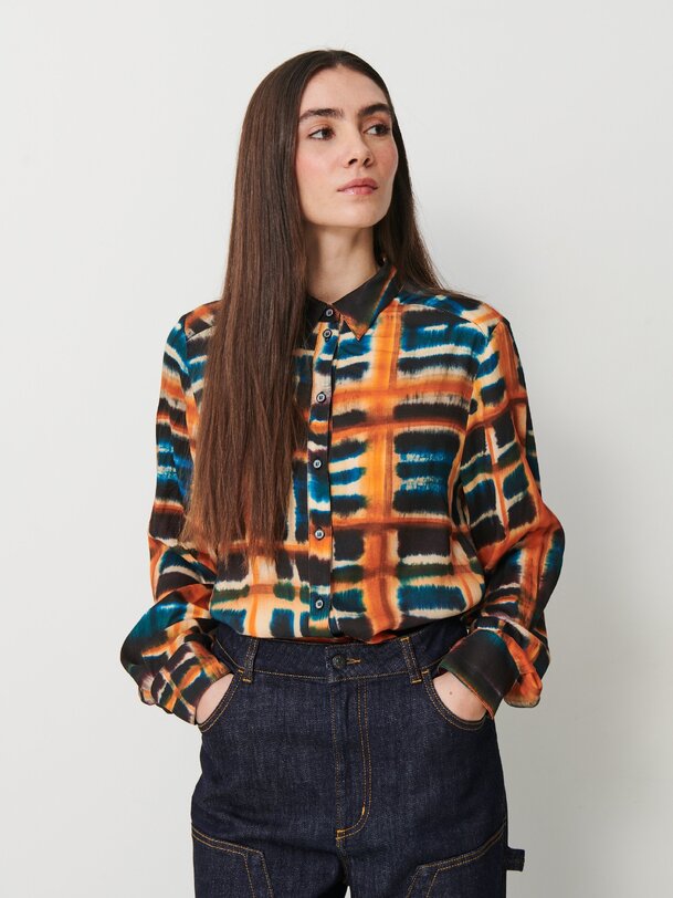 The Noémie shirt boldly revisits tie-dye. A graphic print in warm, deep hues, presented on a soft, lightweight cotton poplin. Classic collar, long sleeves, and a straight cut: an essential with a free and creative twist.